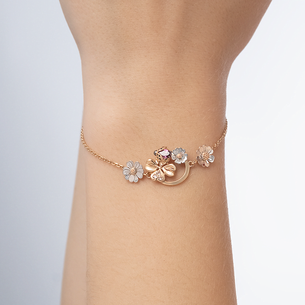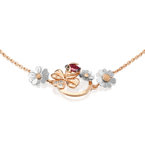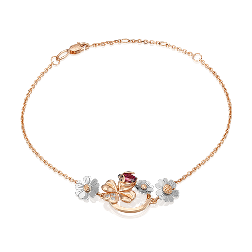 Фантазийный браслет из красного и белого золота 585 пробы на цепочке с замком-карабином. Длина цепочки регулируется. Дизайн украшения сложный, в стиле анималистика, модерн. Центральный декоративный элемент представляет композицию из силуэтов ромашки (Искренность), четырёхлистного клевера (Удача) и божьей коровки (Исполнение желаний). Изделие инкрустировано гранатом родолитом и бесцветными топазами, закрепка которых выполнена вручную. Браслет подойдёт в качестве коктейльного, вечернего, к повседневному и деловому гардеробу.