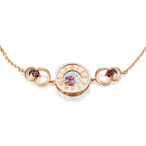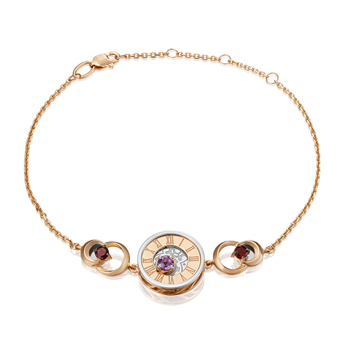 Браслет-часы на цепочке из красного и белого золота 585 пробы с гранатом (размер 17-21, замок-карабин) из коллекции COSMOS ювелирного бренда PLATINA. Дизайн украшений в стиле фантазийный модерн. Основной декоративный элемент – силуэт часов, украшенный фактурными рисунками механизма и циферблата, а также гранатом родолитом. По обе стороны от него – декоративные элементы в виде полумесяцев с гранатами пиропами. Украшение подойдёт в качестве вечернего или коктейльного, в неформальный гардероб.