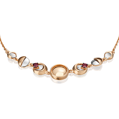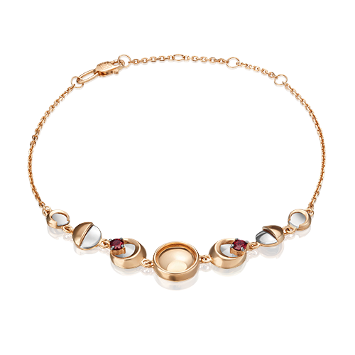 Браслет-цепочка из красного и белого золота 585 пробы с гранатом (размер 17-21, замок-карабин) из коллекции COSMOS ювелирного бренда PLATINA. Дизайн украшений в стиле модерн с элементами геометрии. Ансамбль декоративных элементов представляет собой символическое изображение основных лунных фаз (растущая, половина, полнолуние, убыль); симметрично дополнен двумя натуральными гранатами пиропами. Браслет подойдёт в качестве коктейльного, вечернего, в неформальный гардероб, для повседневного ношения.