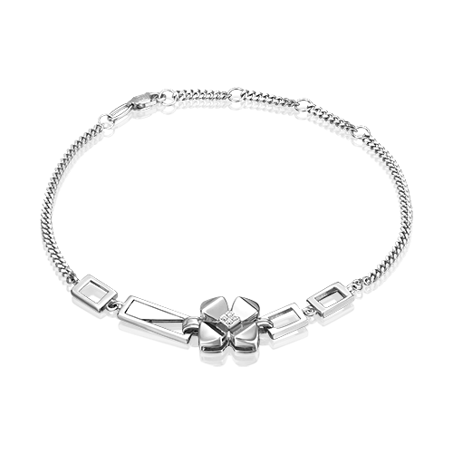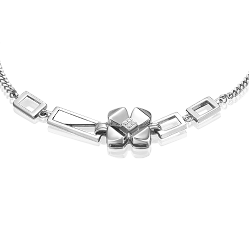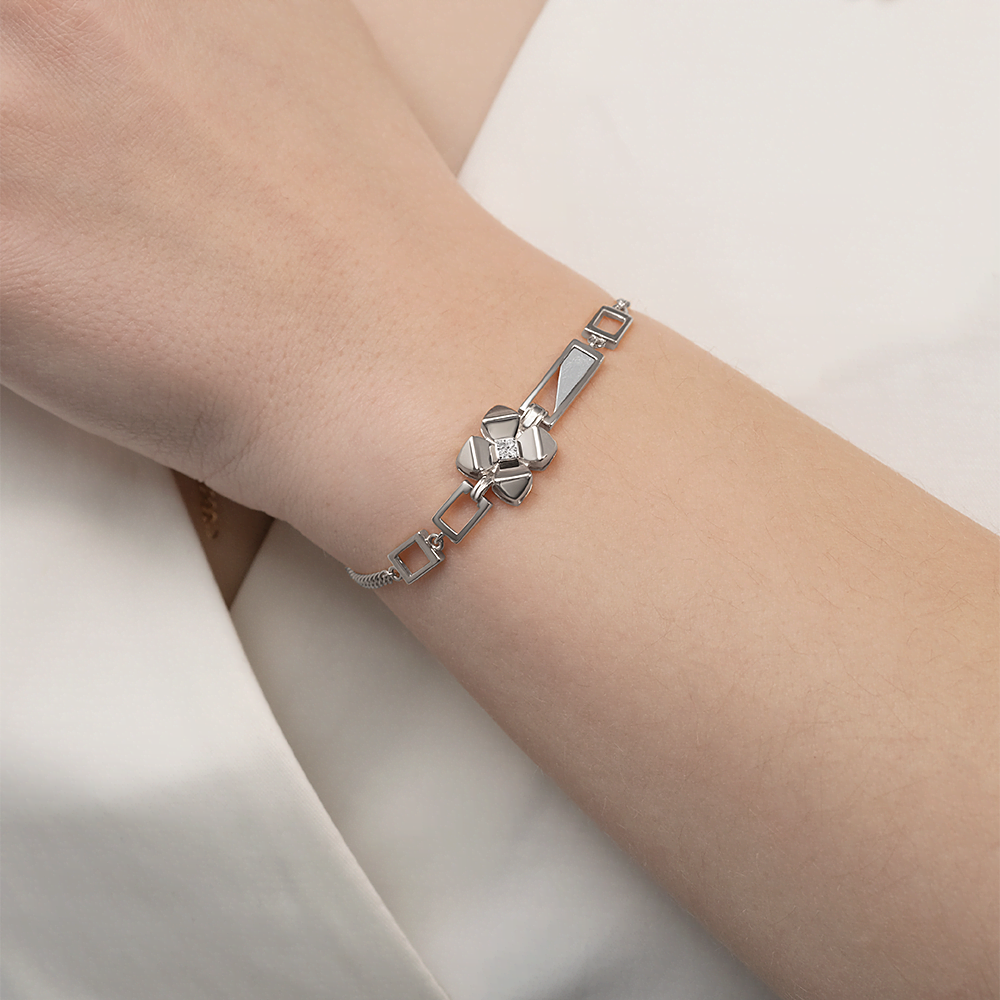 Броский и стильный браслет из белого золота 585 пробы с бриллиантами из коллекции PLATINA BRILLIANCE от ювелирного бренда PLATINA. Дизайн украшения в стиле современная классика, геометрия и флористика. В центре декоративной композиции фантазийный золотой цветок с объёмными лепестками. В сердцевине цветок инкрустирован натуральными бриллиантами классической огранки. Закрепка камней выполнена вручную. Браслет подойдёт для коктейльных и вечерних мероприятий, а также к деловому и повседневному гардеробу.