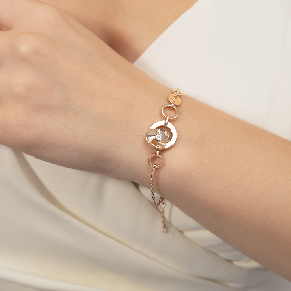 Объёмный браслет из красного и белого золота 585 пробы с бриллиантами из коллекции PLATINA BRILLIANCE от ювелирного бренда PLATINA. Дизайн украшения в стиле современная классика, геометрия и флористика с асимметричным силуэтом. Фантазийный золотой цветок инкрустирован натуральными бриллиантами классической огранки. Закрепка камней выполнена вручную. Браслет подойдёт для коктейльных и праздничных мероприятий, а также к деловому и повседневному гардеробу.