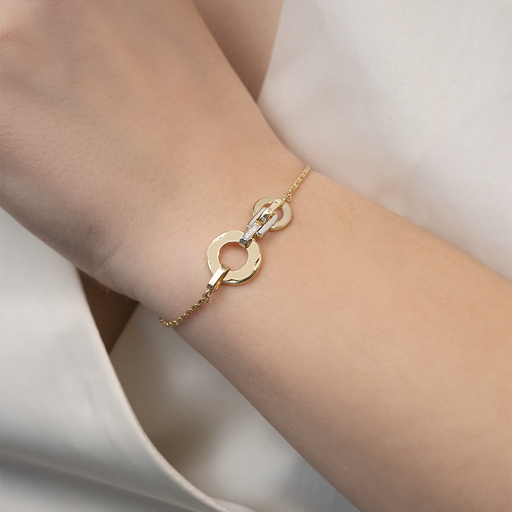 Лаконичный браслет из лимонного (желтого) и белого золота 585 пробы с бриллиантами из коллекции PLATINA BRILLIANCE от ювелирного бренда PLATINA. Дизайн украшения в стиле современная классика и геометрия. В центре декоративной композиции браслет инкрустирован натуральными бриллиантами. Элемент из белого золота покрыт белым родием. Закрепка камней и родирование выполнены вручную. Браслет подойдёт для коктейльных и вечерних мероприятий, а также к деловому и повседневному гардеробу.
