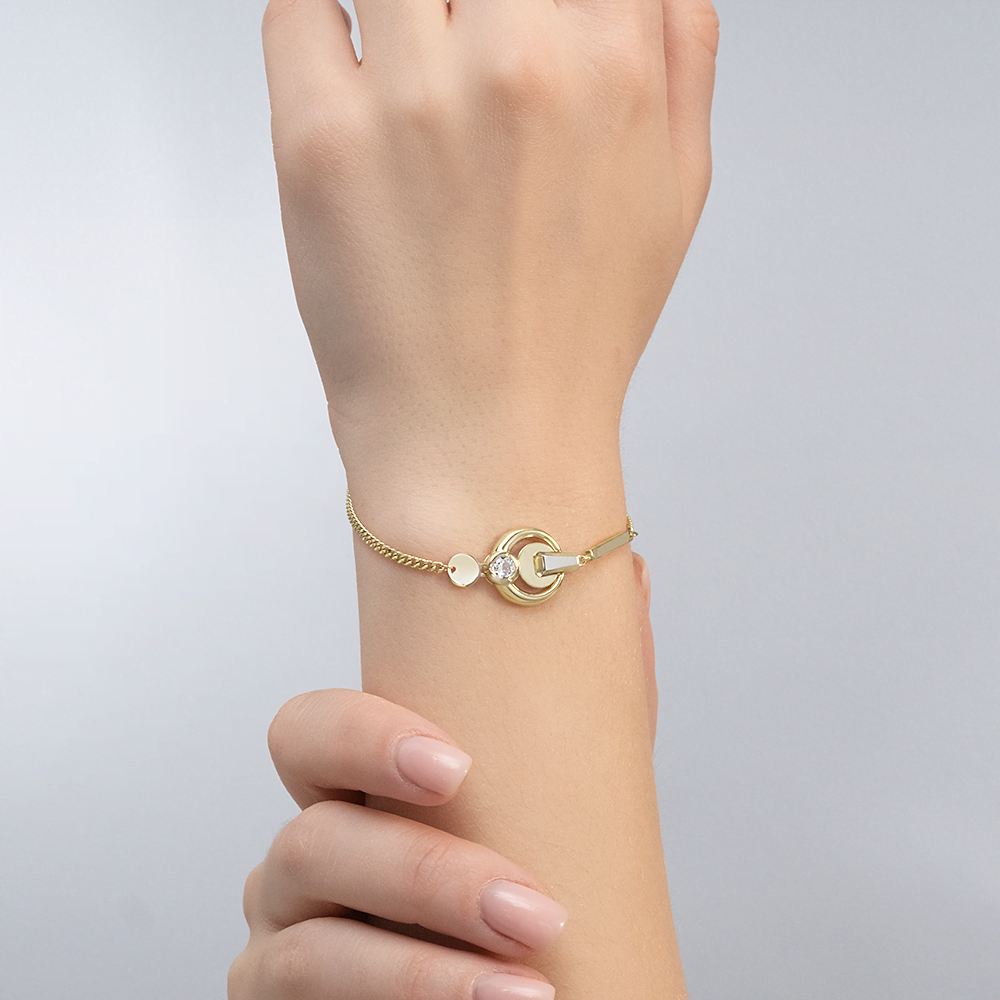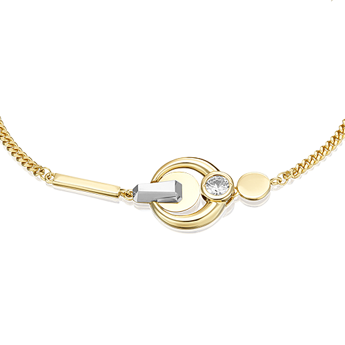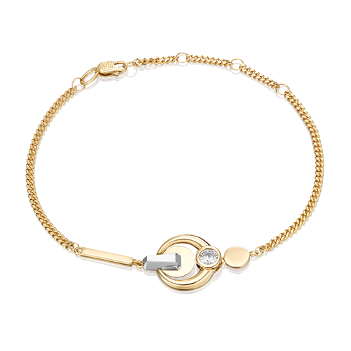 Изящный браслет на цепочке из лимонного (желтого) и белого золота 585 пробы с white-топазом из коллекции PLATINA VIEW от ювелирного бренда PLATINA. Дизайн украшения в стиле геометрия, с асимметричной декоративной композицией. Браслет инкрустирован натуральным white-топазом, закрепка которого выполнена вручную. Украшение подойдёт для коктейльных мероприятий, а также к деловому и повседневному гардеробу.