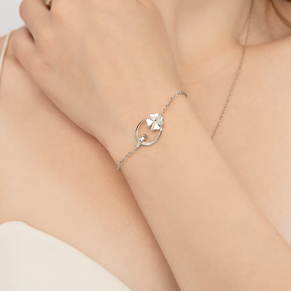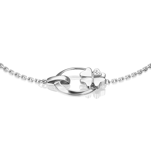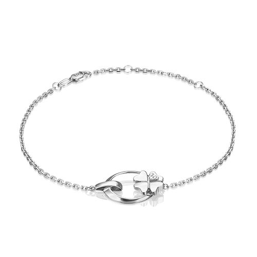Браслет на цепочке из белого золота 585 пробы с бриллиантами из коллекции PLATINA ONE от ювелирного бренда PLATINA. Длина цепочки регулируется. Дизайн украшения лаконичный – в стиле флористика и геометрия. Центральная композиция выполнена с силуэтом четырёхлистного клевера на кольце. Дополняет дизайн литьевая накладка на лепестке, инкрустированная бриллиантами. Закрепка камней выполнена вручную. Браслет подойдёт для коктейльных и праздничных мероприятий, а также для повседневного или делового гардероба.