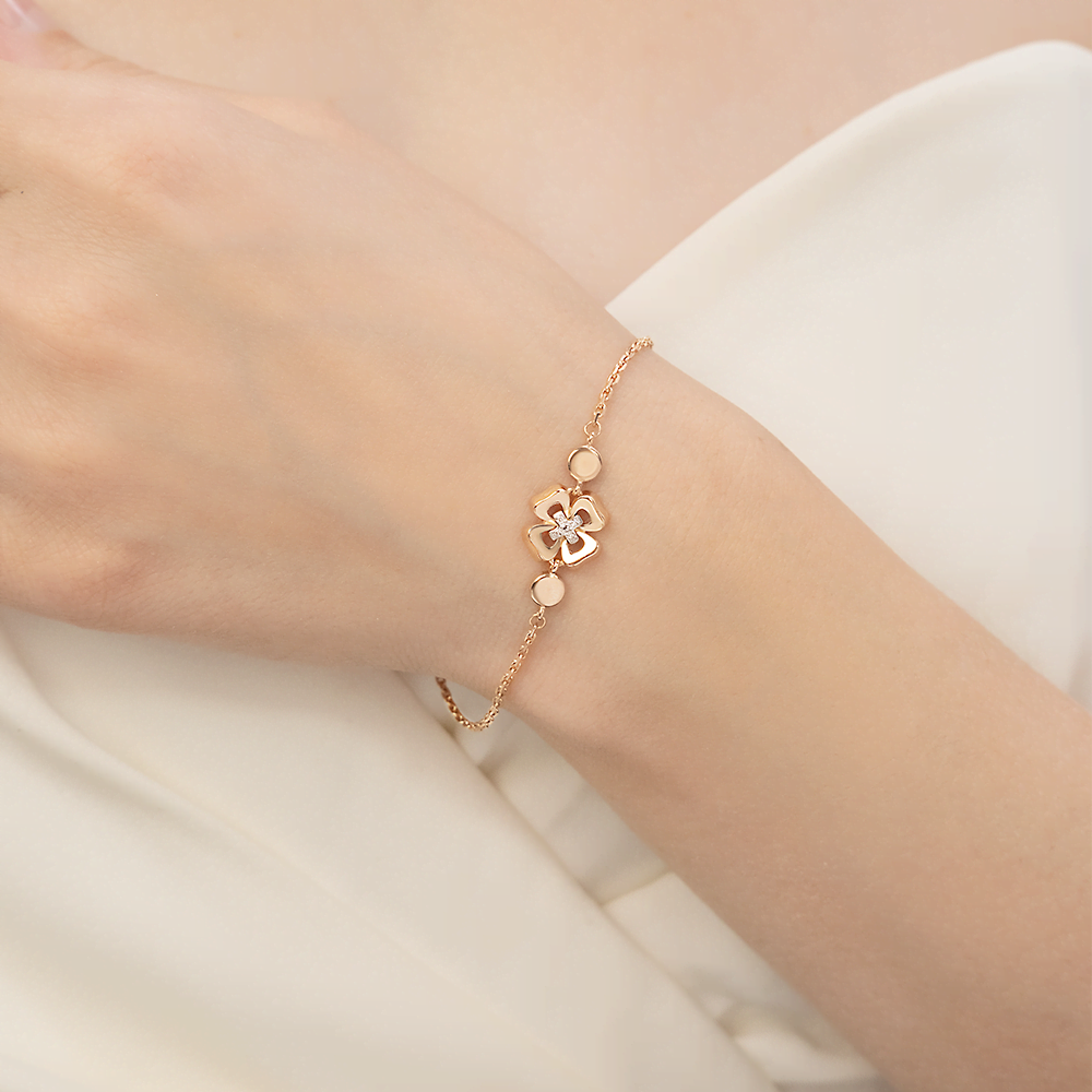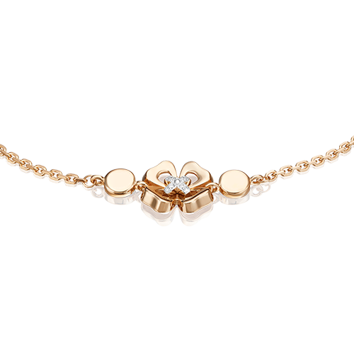 Браслет на цепочке из красного и белого золота 585 пробы с бриллиантами из коллекции PLATINA ONE от ювелирного бренда PLATINA. Длина цепочки регулируется. Дизайн украшения лаконичный – в стиле флористика и геометрия. Центральная композиция выполнена с силуэтом объёмного четырёхлистного клевера и дополнена элементами в форме круга. В центре цветок инкрустирован бриллиантами. Закрепка камней выполнена вручную. Браслет подойдёт для коктейльных и праздничных мероприятий, а также для повседневного или делового гардероба.