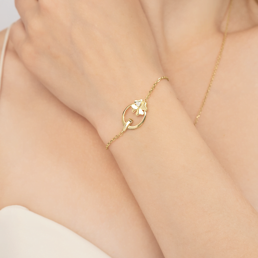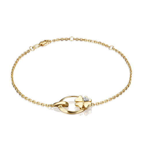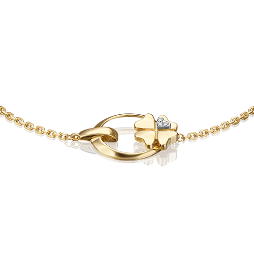 Браслет на цепочке из лимонного (желтого) и белого золота 585 пробы с бриллиантами из коллекции PLATINA ONE от ювелирного бренда PLATINA. Длина цепочки регулируется. Дизайн украшения лаконичный – в стиле флористика и геометрия. Центральная композиция выполнена с силуэтом четырёхлистного клевера на кольце. Дополняет дизайн литьевая накладка из белого золота на лепестке, инкрустированная бриллиантами. Закрепка камней выполнена вручную. Браслет подойдёт для коктейльных и праздничных мероприятий, а также для повседневного или делового гардероба.