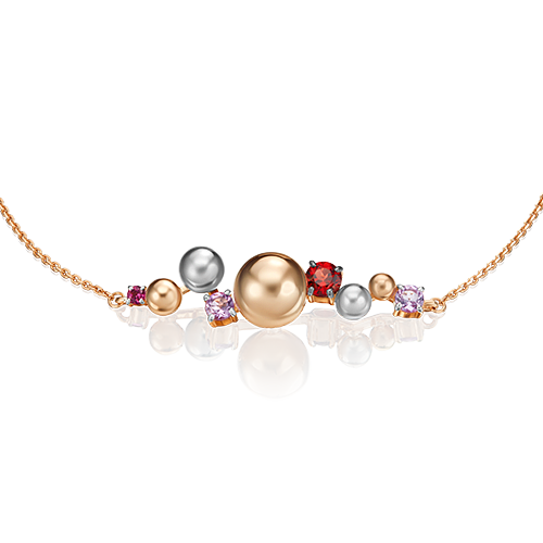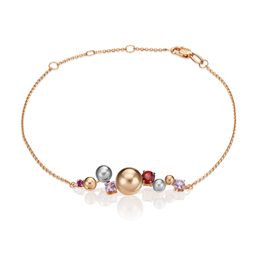 Коктейльный браслет-цепочка из красного и белого золота 585 пробы с гранатом и аметистом (размер 17-21, замок-карабин) из коллекции COSMOS ювелирного бренда PLATINA. Дизайн украшения в стиле геометрия, модерн. Декоративный элемент изделия представляет собой асимметричный ансамбль из золотых сфер разных размеров, натуральных аметистов и гранатов (пироп и родолит). Браслет подойдёт в качестве вечернего или яркого коктейльного, а также в неформальный/бизнес-гардероб.