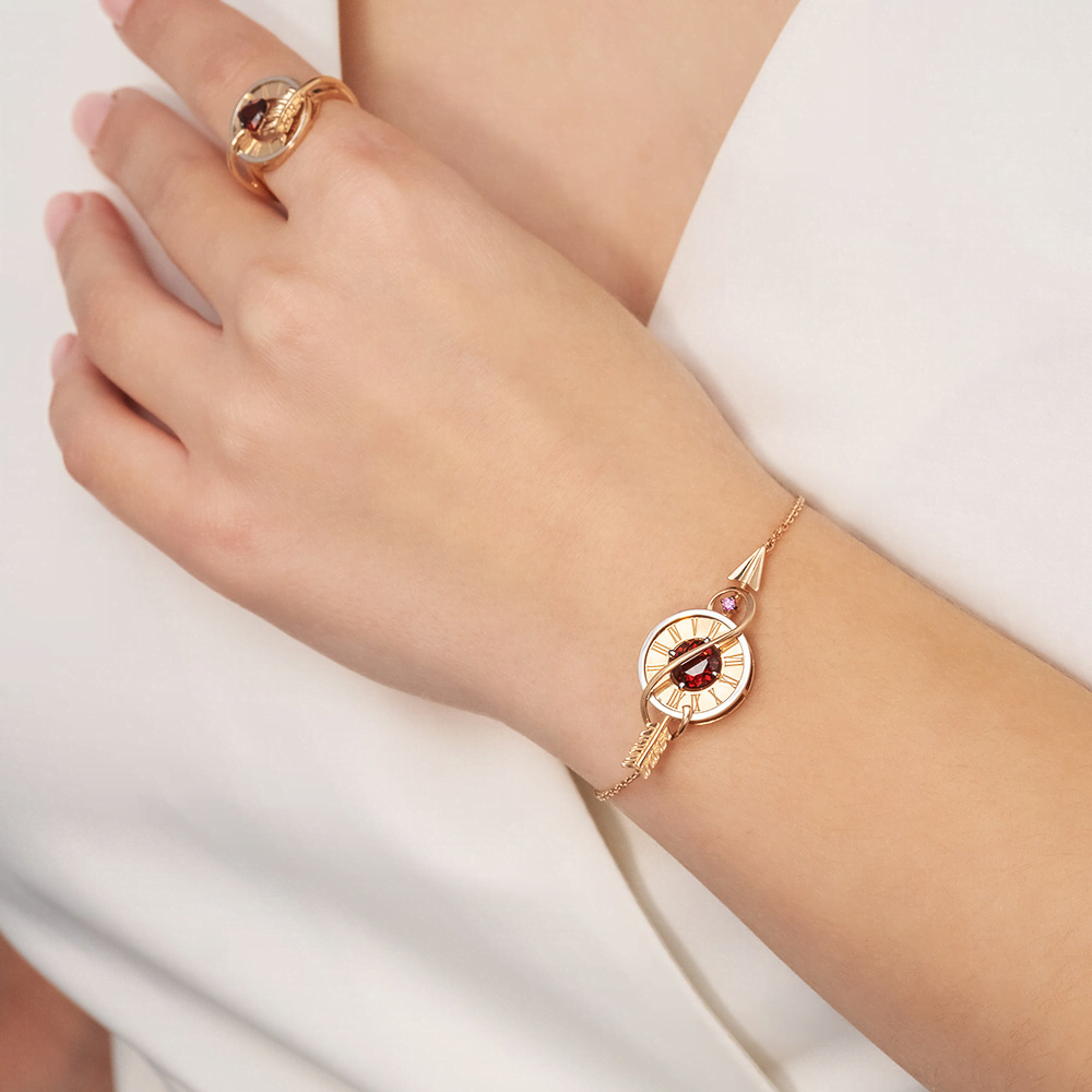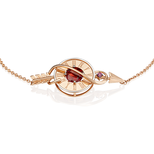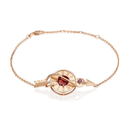 Фантазийный браслет из красного и белого золота 585 пробы на цепочке с замком-карабином. Длина цепочки регулируется. Дизайн украшения сложный, в стиле модерн. Центральный декоративный элемент представляет композицию из силуэтов циферблата часов (символ Течения жизни), стрелы (Достижение цели) и бесконечности (Вечность, Гармония). Изделие инкрустировано натуральными гранатами розового и красного оттенка, закрепка которых выполнена вручную. Браслет подойдёт в качестве коктейльного, вечернего, к повседневному и деловому гардеробу.