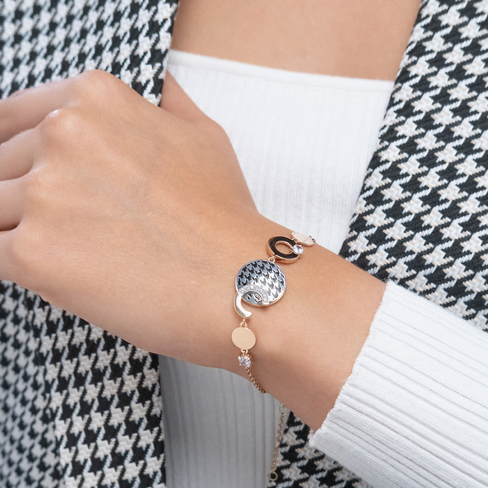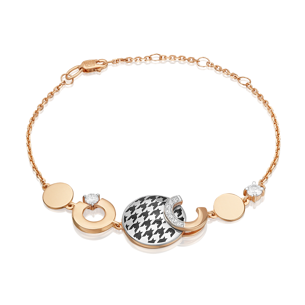 Выразительный браслет из красного и белого золота 585 пробы с фианитами и модным принтом Гусиная лапка из коллекции FASHION by PLATINA от ювелирного бренда PLATINA. Дизайн украшения в стиле геометрия и минимализм. Фактурный принт нанесён с помощью лазерной гравировки. Роспись чёрной краской эмали добавляет ему колоритность. Украшение инкрустировано бесцветными фианитами. Закрепка камней и эмалирование выполнены вручную. Браслет станет модным акцентом в повседневном или деловом образе и эффектно дополнит вечерний или коктейльный наряд. Браслет (на карабине, с цепью качественного плетения) — популярное и актуальное украшение (jewelry). Все украшения от бренда PLATINA (Ювелирный завод ПЛАТИНА) приходят в красивой фирменной подарочной упаковке, а значит, идеально подходят для стильного подарка любимой женщине, девушке, жене, маме, мачехе, сестре, бабушке, тете, дочери, племяннице, родственнице, снохе, невестке, свекрови, теще, подруге, учителю, коллеге по работе. Если вы хоть раз задавались вопросом: Что особенного подарить любимому человеку? Украшение из драгоценных металлов станет прекрасной и оригинальной идеей! А выбирая ювелирные изделия от PLATINA, Вы можете быть уверены, что каждое из них станет идеальным, памятным и по-настоящему запоминающимся подарком на День рождения, годовщину свадьбы, Новый год, Рождество, именины, 8 марта, день всех влюбленных (14 февраля), день матери, выпускной, юбилей, на рождение ребенка, на профессиональный праздник, или любой другой повод.