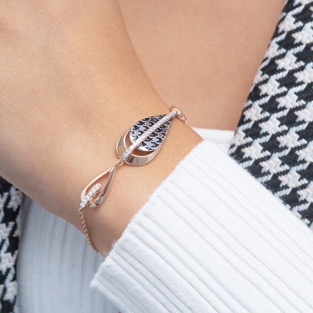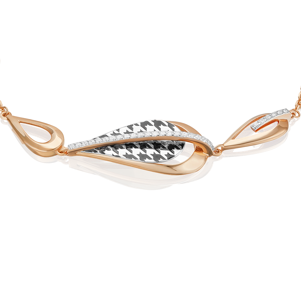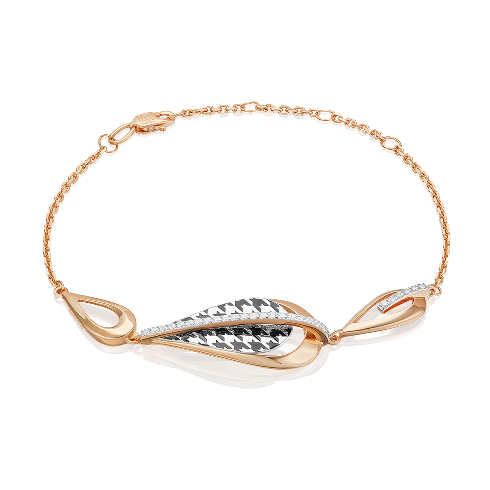 Изящный браслет из красного и белого золота 585 пробы с фианитами и ярким принтом Гусиная лапка из коллекции FASHION by PLATINA от ювелирного бренда PLATINA. Дизайн украшения в стиле геометрия и минимализм, с элегантным силуэтом. Фактурный принт нанесён с помощью лазерной гравировки. Роспись чёрной краской эмали добавляет ему колоритность. Украшение инкрустировано бесцветными фианитами. Закрепка камней и эмалирование выполнены вручную. Браслет станет модным акцентом в повседневном или деловом образе и дополнит стильным звучанием вечерний или коктейльный наряд. Браслет (на карабине, с цепью качественного плетения) — популярное и актуальное украшение (jewelry). Все украшения от бренда PLATINA (Ювелирный завод ПЛАТИНА) приходят в красивой фирменной подарочной упаковке, а значит, идеально подходят для стильного подарка любимой женщине, девушке, жене, маме, мачехе, сестре, бабушке, тете, дочери, племяннице, родственнице, снохе, невестке, свекрови, теще, подруге, учителю, коллеге по работе. Если вы хоть раз задавались вопросом: Что особенного подарить любимому человеку? Украшение из драгоценных металлов станет прекрасной и оригинальной идеей! А выбирая ювелирные изделия от PLATINA, Вы можете быть уверены, что каждое из них станет идеальным, памятным и по-настоящему запоминающимся подарком на День рождения, годовщину свадьбы, Новый год, Рождество, именины, 8 марта, день всех влюбленных (14 февраля), день матери, выпускной, юбилей, на рождение ребенка, на профессиональный праздник, или любой другой повод.