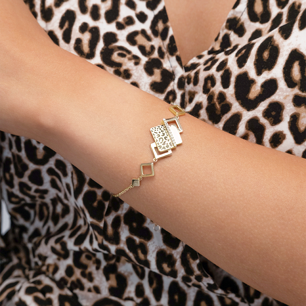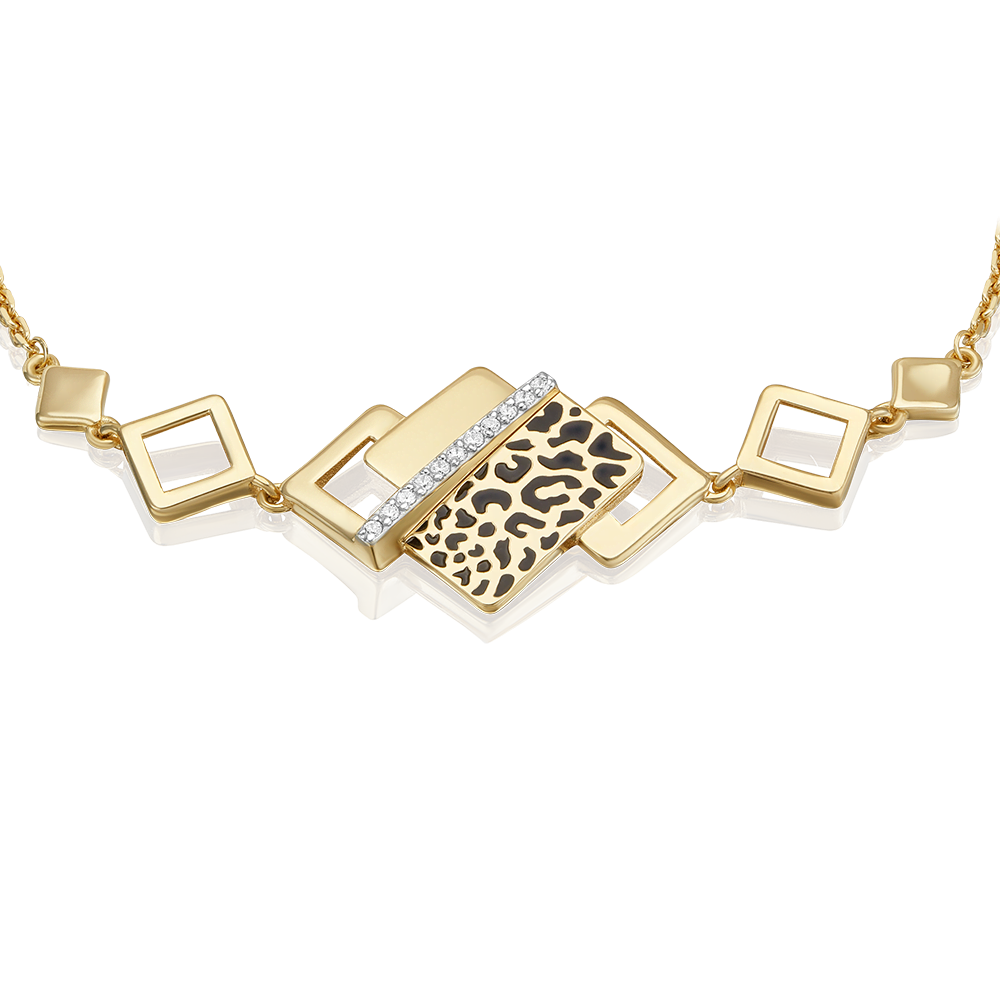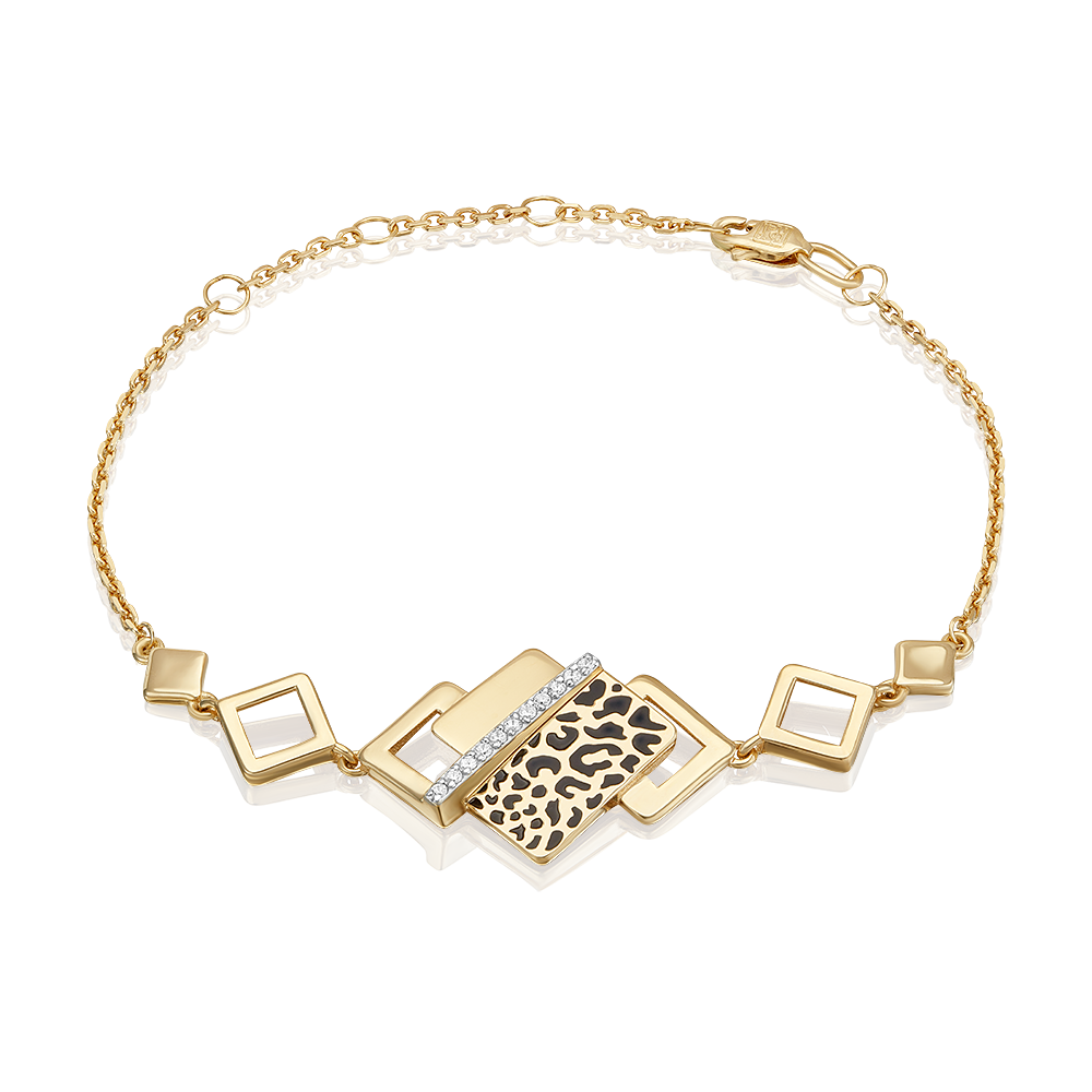 Стильный браслет из лимонного (желтого) золота 585 пробы с фианитами и модным принтом Леопард из коллекции FASHION by PLATINA от ювелирного бренда PLATINA. Дизайн украшения в стиле геометрия и минимализм. Принт нанесён с помощью красок эмали. Центральный декоративный элемент инкрустирован миниатюрными бесцветными фианитами. Закрепка камней и эмалирование выполнены вручную. Браслет станет модной изюминкой повседневного или делового образа, а также добавит стильное звучание коктейльному или вечернему. Браслет (на карабине, с цепью качественного плетения) — популярное и актуальное украшение (jewelry). Все украшения от бренда PLATINA (Ювелирный завод ПЛАТИНА) приходят в красивой фирменной подарочной упаковке, а значит, идеально подходят для стильного подарка любимой женщине, девушке, жене, маме, мачехе, сестре, бабушке, тете, дочери, племяннице, родственнице, снохе, невестке, свекрови, теще, подруге, учителю, коллеге по работе. Если вы хоть раз задавались вопросом: Что особенного подарить любимому человеку? Украшение из драгоценных металлов станет прекрасной и оригинальной идеей! А выбирая ювелирные изделия от PLATINA, Вы можете быть уверены, что каждое из них станет идеальным, памятным и по-настоящему запоминающимся подарком на День рождения, годовщину свадьбы, Новый год, Рождество, именины, 8 марта, день всех влюбленных (14 февраля), день матери, выпускной, юбилей, на рождение ребенка, на профессиональный праздник, или любой другой повод.