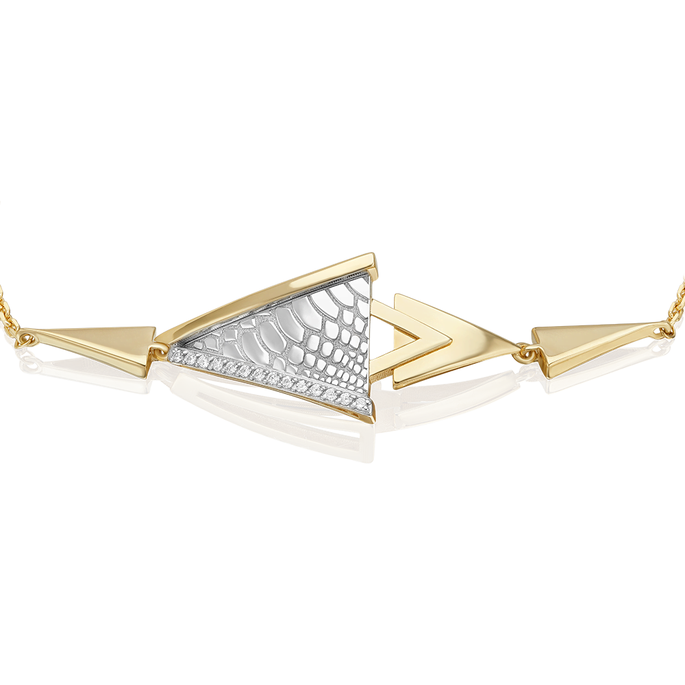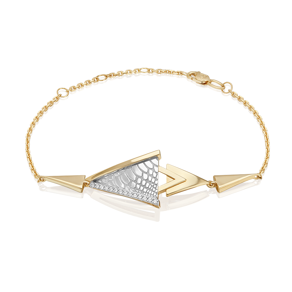 Элегантный браслет из лимонного (желтого) и белого золота 585 пробы с фианитами и фактурным принтом Питон из коллекции FASHION by PLATINA от ювелирного бренда PLATINA. Дизайн украшения лаконичный, в стиле геометрия и минимализм. Фактурный принт нанесён с помощью лазерной гравировки. Украшение инкрустировано вручную бесцветными миниатюрными фианитами. Сияние камней эффектно перекликается с блеском белого золота. Браслет станет модным акцентом в повседневном или деловом образе, а также дополнит стильным звучанием вечерний или коктейльный наряд. Браслет (на карабине, с цепью качественного плетения) — популярное и актуальное украшение (jewelry). Все украшения от бренда PLATINA (Ювелирный завод ПЛАТИНА) приходят в красивой фирменной подарочной упаковке, а значит, идеально подходят для стильного подарка любимой женщине, девушке, жене, маме, мачехе, сестре, бабушке, тете, дочери, племяннице, родственнице, снохе, невестке, свекрови, теще, подруге, учителю, коллеге по работе. Если вы хоть раз задавались вопросом: Что особенного подарить любимому человеку? Украшение из драгоценных металлов станет прекрасной и оригинальной идеей! А выбирая ювелирные изделия от PLATINA, Вы можете быть уверены, что каждое из них станет идеальным, памятным и по-настоящему запоминающимся подарком на День рождения, годовщину свадьбы, Новый год, Рождество, именины, 8 марта, день всех влюбленных (14 февраля), день матери, выпускной, юбилей, на рождение ребенка, на профессиональный праздник, или любой другой повод.