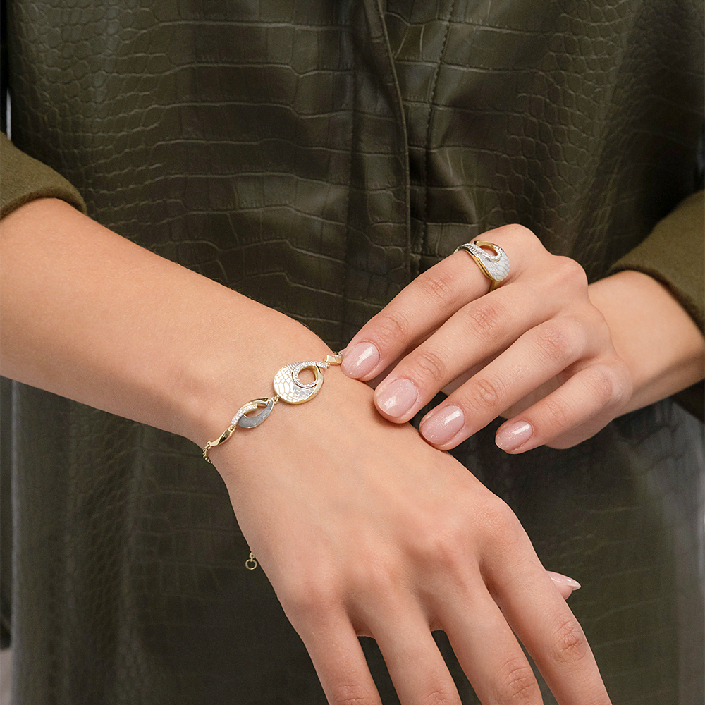 Эффектный браслет из лимонного (желтого) и белого золота 585 пробы с фианитами и фактурным принтом Питон из коллекции FASHION by PLATINA от ювелирного бренда PLATINA. Дизайн украшения элегантный, в стиле геометрия и минимализм. Фактурный принт нанесён с помощью лазерной гравировки. Украшение вручную инкрустировано миниатюрными бесцветными фианитами, сияние которых эффектно перекликается с блеском белого золота. Браслет станет модной изюминкой в повседневном и деловом образе, а также дополнит стильным звучанием вечерний или коктейльный наряд. Браслет (на карабине, с цепью качественного плетения) — популярное и актуальное украшение (jewelry). Все украшения от бренда PLATINA (Ювелирный завод ПЛАТИНА) приходят в красивой фирменной подарочной упаковке, а значит, идеально подходят для стильного подарка любимой женщине, девушке, жене, маме, мачехе, сестре, бабушке, тете, дочери, племяннице, родственнице, снохе, невестке, свекрови, теще, подруге, учителю, коллеге по работе. Если вы хоть раз задавались вопросом: Что особенного подарить любимому человеку? Украшение из драгоценных металлов станет прекрасной и оригинальной идеей! А выбирая ювелирные изделия от PLATINA, Вы можете быть уверены, что каждое из них станет идеальным, памятным и по-настоящему запоминающимся подарком на День рождения, годовщину свадьбы, Новый год, Рождество, именины, 8 марта, день всех влюбленных (14 февраля), день матери, выпускной, юбилей, на рождение ребенка, на профессиональный праздник, или любой другой повод.