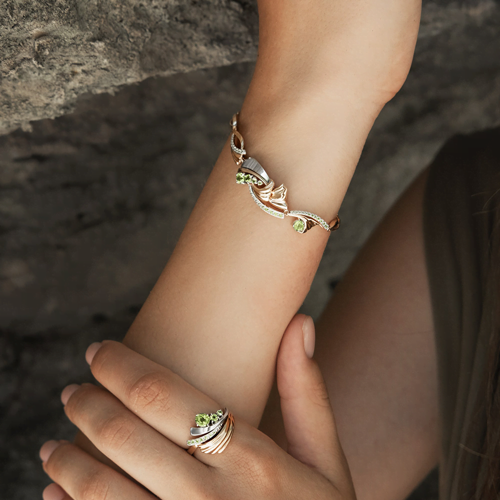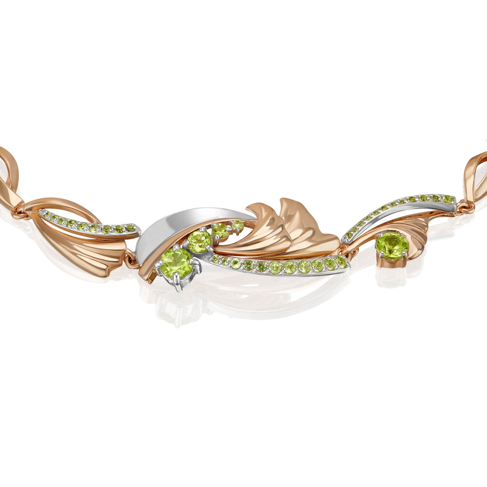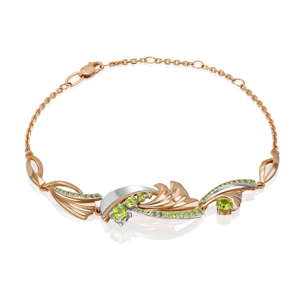 Изящный браслет из красного и белого золота 585 пробы с натуральными хризолитами из коллекции PLATINA ELEMENTS от ювелирного бренда PLATINA. Дизайн украшения сложный, метафоричный. Ювелирный образ олицетворяет Стихию Земли: её вдохновляющую и пробуждающую силу. Уникальная энергетика нежных хризолитов и интересная фактура металла усиливают эмоциональность образа. Закрепка камней выполнена вручную. Браслет эффектно дополнит повседневный и деловой стиль, а также станет выразительным штрихом в вечернем и коктейльном образе. Браслет (на карабине, с цепью качественного плетения) — популярное и актуальное украшение (jewelry). Все украшения от бренда PLATINA (Ювелирный завод ПЛАТИНА) приходят в красивой фирменной подарочной упаковке, а значит, идеально подходят для стильного подарка любимой женщине, девушке, жене, маме, мачехе, сестре, бабушке, тете, дочери, племяннице, родственнице, снохе, невестке, свекрови, теще, подруге, учителю, коллеге по работе. Если вы хоть раз задавались вопросом: Что особенного подарить любимому человеку? Украшение из драгоценных металлов станет прекрасной и оригинальной идеей! А выбирая ювелирные изделия от PLATINA, Вы можете быть уверены, что каждое из них станет идеальным, памятным и по-настоящему запоминающимся подарком на День рождения, годовщину свадьбы, Новый год, Рождество, именины, 8 марта, день всех влюбленных (14 февраля), день матери, выпускной, юбилей, на рождение ребенка, на профессиональный праздник, или любой другой повод.