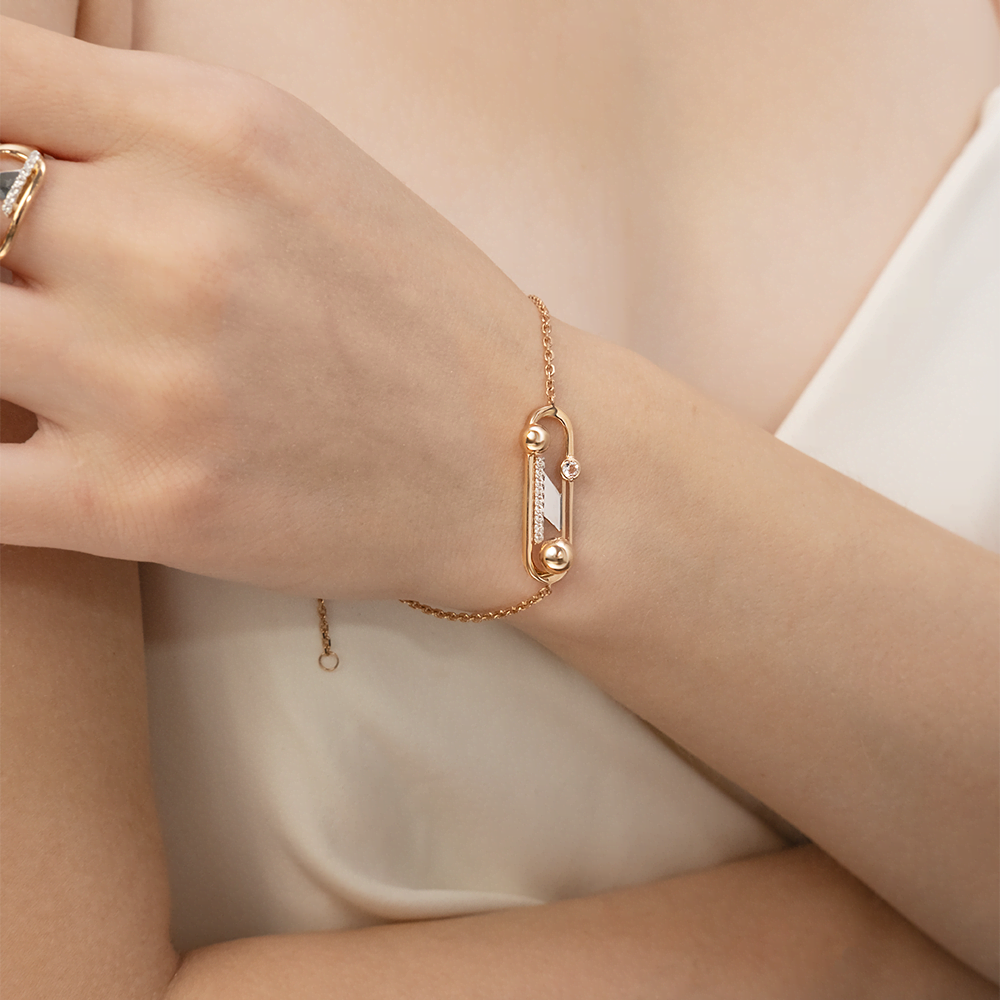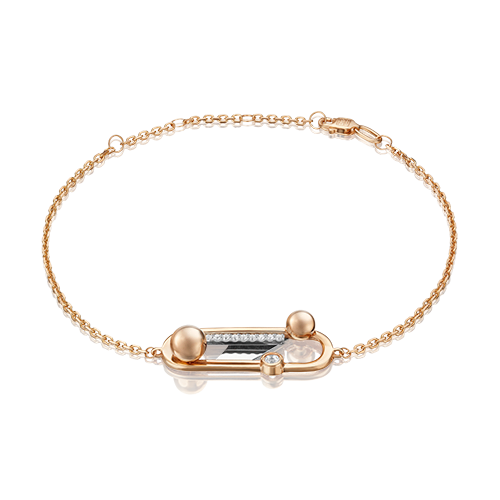 Браслет из красного и белого золота 585 пробы на цепочке с white-топазами из коллекции PLATINA LINE от ювелирного бренда PLATINA. Дизайн украшения в стиле минимализм и геометрия. Композиция декоративной части многослойная, имитирует силуэт скрепки, с асимметричным расположением разных по размеру шаров на овальном элементе. Изделие инкрустировано натуральными white-топазами, закрепка которых выполнена вручную. Браслет подойдёт к деловому и повседневному гардеробу, а также для коктейльных и вечерних мероприятий.