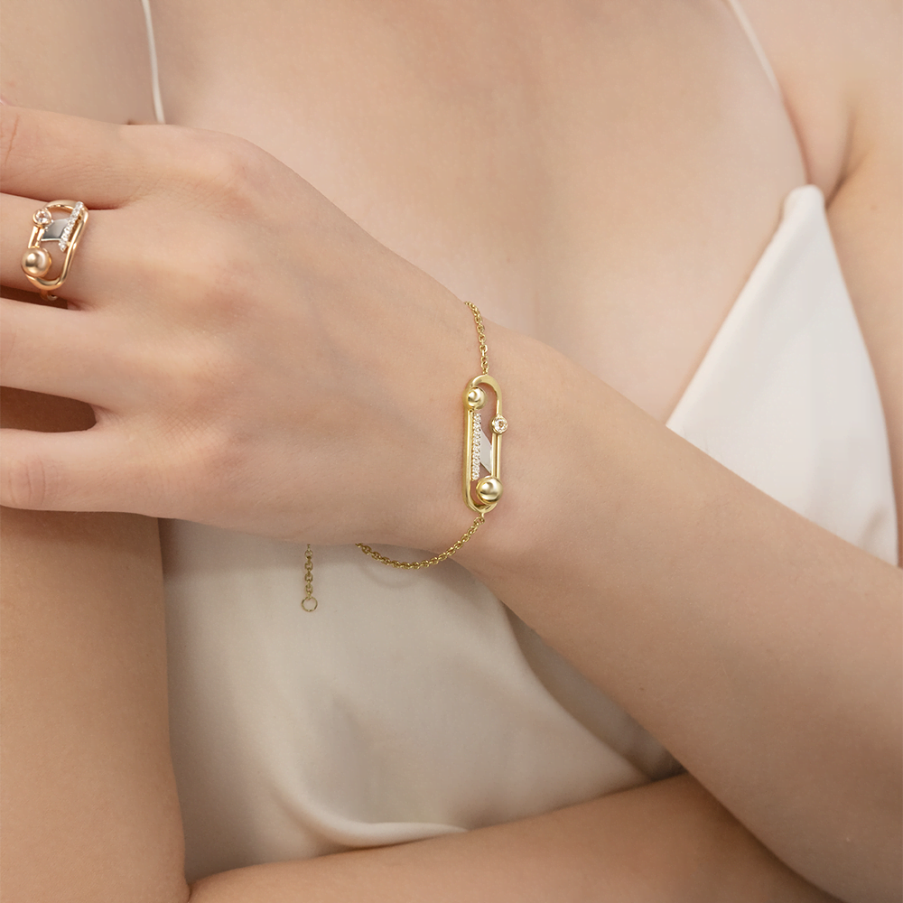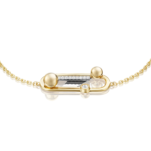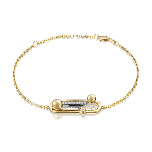 Браслет из лимонного (желтого) и белого золота 585 пробы на цепочке с white-топазами из коллекции PLATINA LINE от ювелирного бренда PLATINA. Дизайн украшения в стиле минимализм и геометрия. Композиция декоративной части многослойная, имитирует силуэт скрепки, с асимметричным расположением разных по размеру шаров на овальном элементе. Украшение инкрустировано натуральными white-топазами, закрепка которых выполнена вручную. Браслет подойдёт к деловому и повседневному гардеробу, а также для коктейльных и вечерних мероприятий.