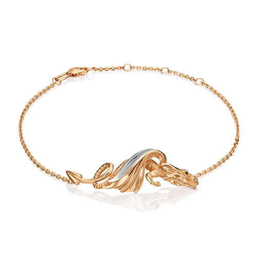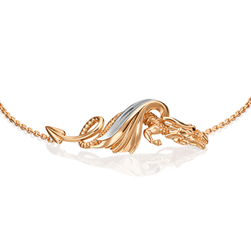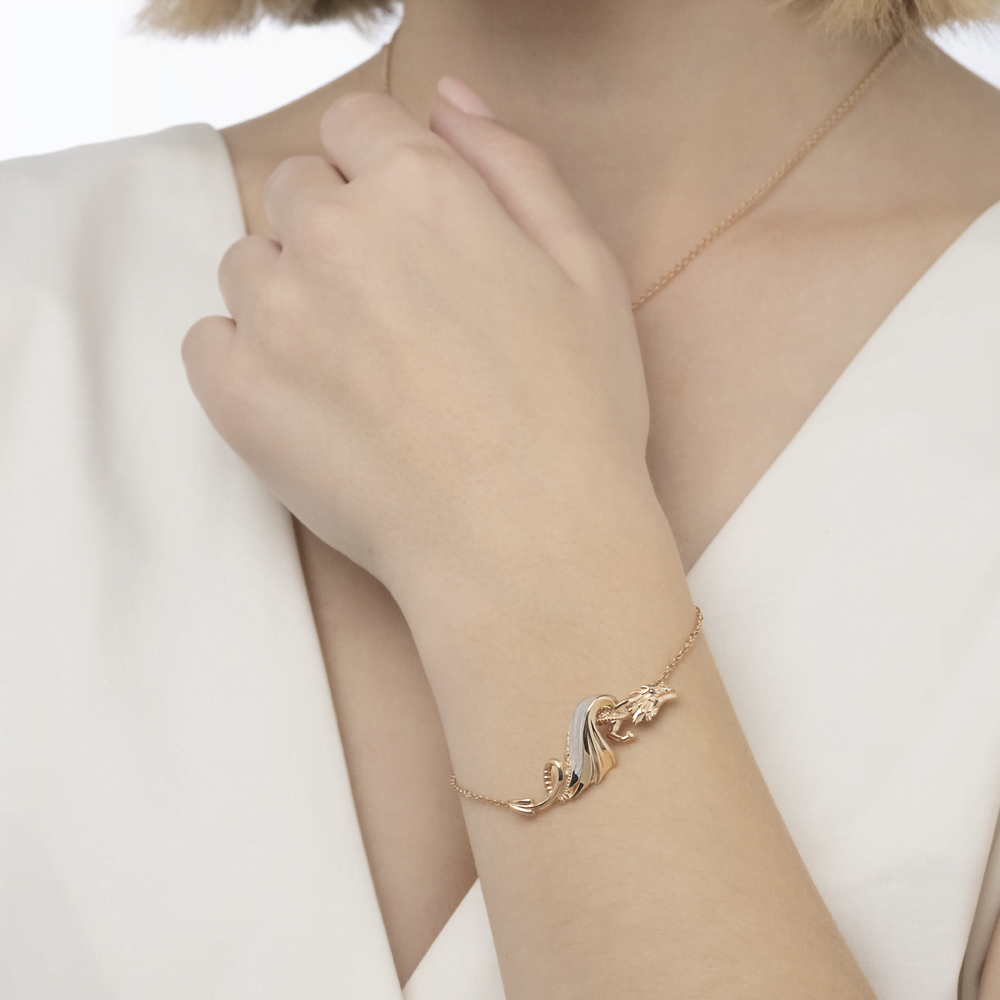 Фантазийный браслет-дракон из красного и белого золота 585 пробы на цепочке с замком-карабином. Длина цепочки регулируется. Дизайн украшения сложный, в стиле анималистика, модерн. Центральный декоративный элемент выполнен с объёмным силуэтом дракона – символом долголетия. Крыло из белого золота символизирует защиту. Браслет подойдёт в качестве коктейльного, вечернего, к повседневному и деловому гардеробу.