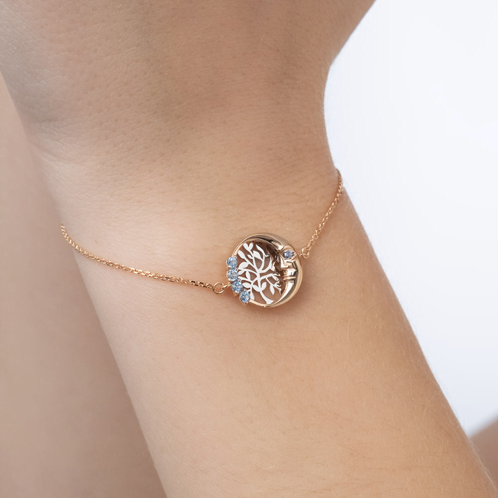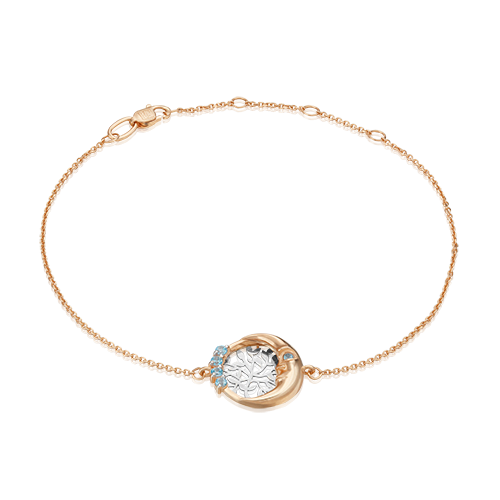 Фантазийный браслет из красного и белого золота 585 пробы на цепочке с замком-карабином. Длина цепочки регулируется. Дизайн в стиле модерн. Декоративный элемент представляет композицию из силуэтов луны (Плодородие) и Древа жизни (Возрождение). Изделие инкрустировано натуральными топазами, закрепка которых выполнена вручную. Браслет подойдёт в качестве вечернего, коктейльного, а также к повседневному и деловому гардеробу.