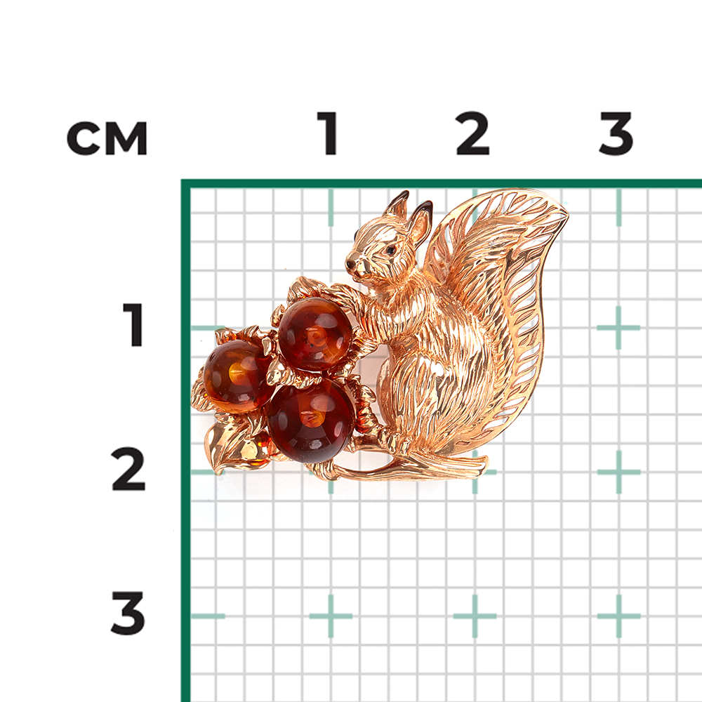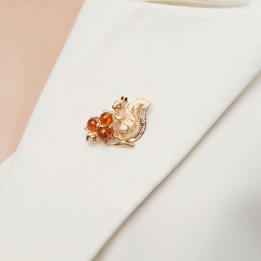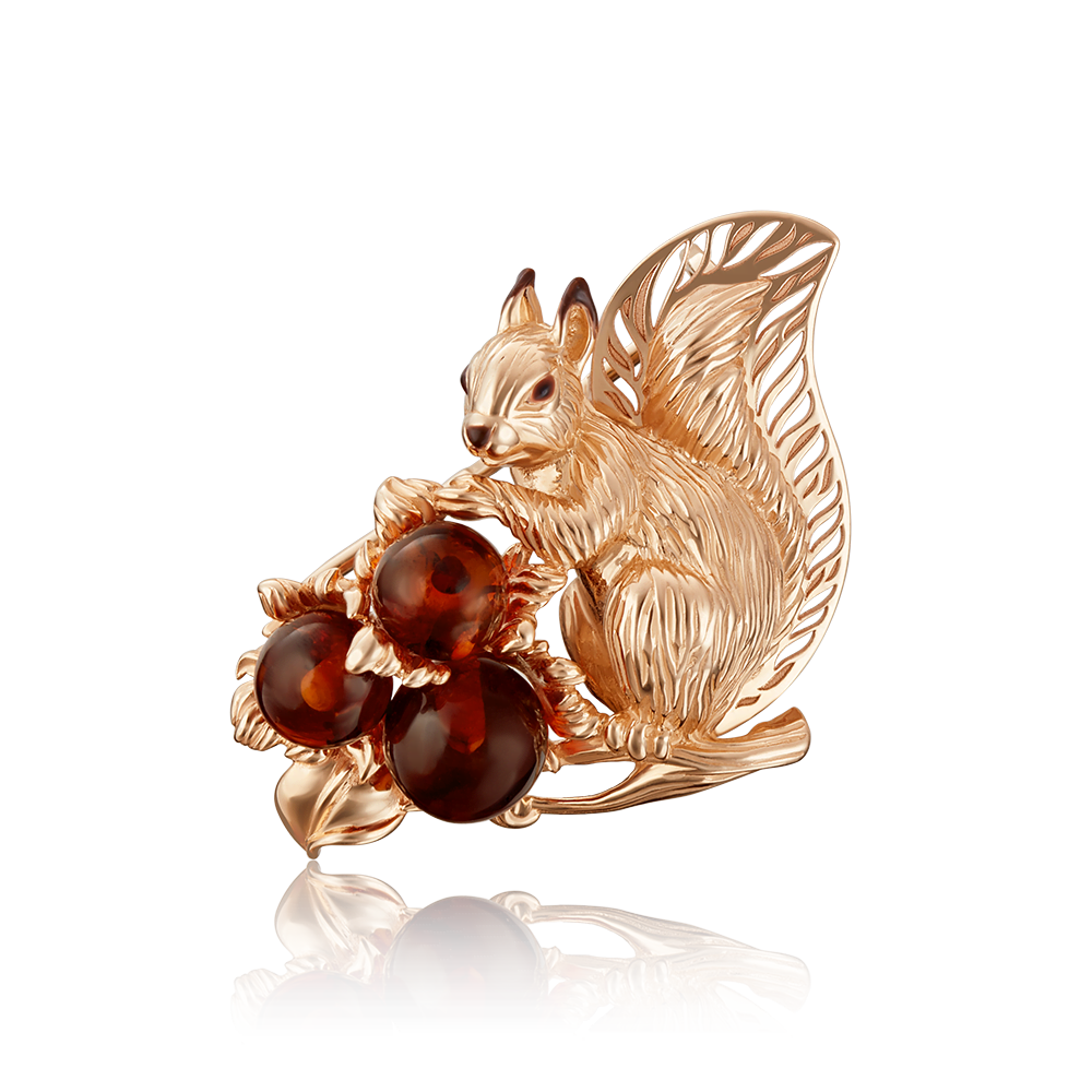 Брошь «Белка» из красного золота с янтарём и эмалью