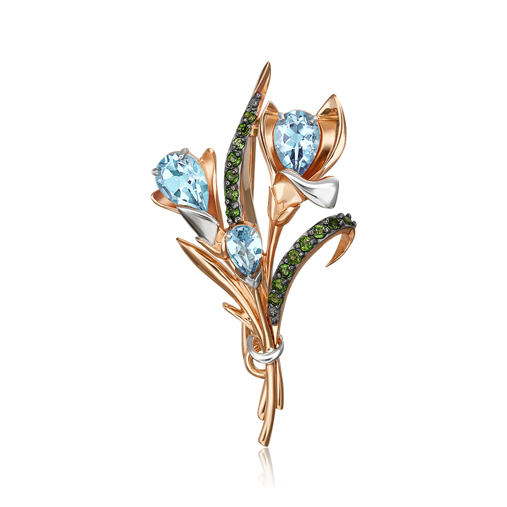 Брошь из красного золота 585 пробы среднего размера, с натуральными топазами и хромдиопсидами. Дизайн украшения выполнен в стиле флористика – с силуэтом цветка крокуса (символ роскоши, власти и счастья). Изделие инкрустировано миниатюрными зелёными хромдиопсидами и топазами огранки груша. Все камни закреплены вручную. Дополняет дизайн украшения светлое родиевое покрытие на лепестках цветка. Украшение подойдёт для торжеств, светских или коктейльных мероприятий, а также для повседневного ношения.
