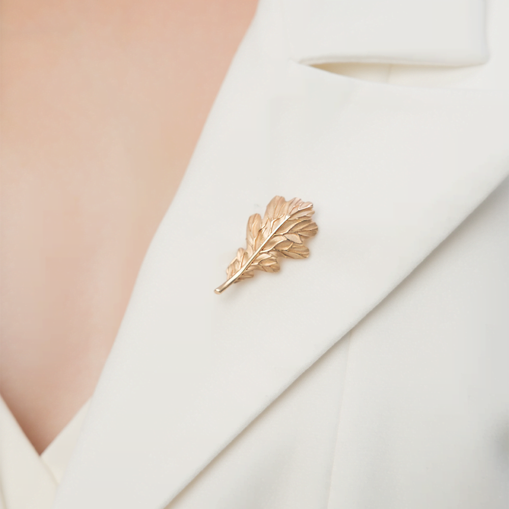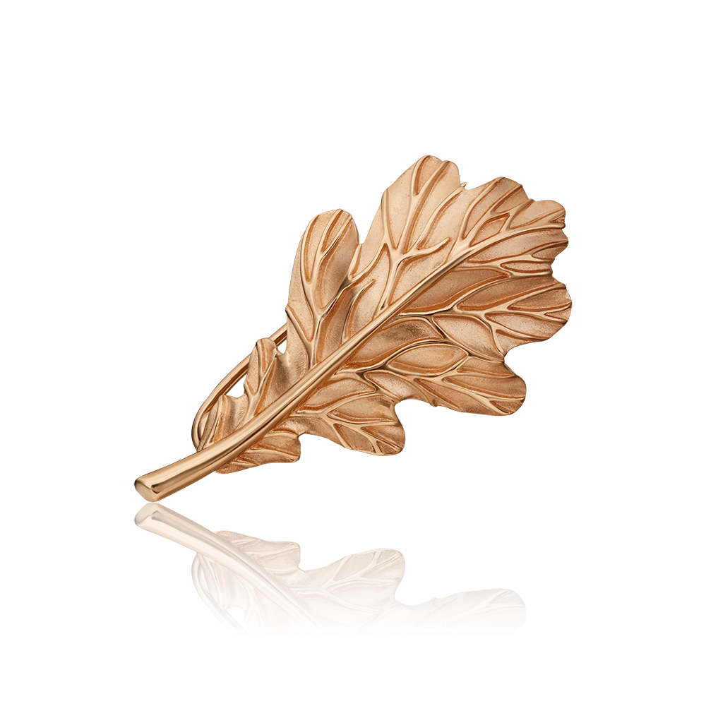 Брошь-булавка из красного золота 585 пробы в виде дубового листа. Дизайн украшения выполнен в стиле флористика. Глянцевый блеск золотых «прожилок» эффектно контрастирует с сатинированной поверхностью листа. Надёжный и удобный замок обеспечивает комфорт при длительном ношении. Брошь подойдёт к повседневному или деловому стилю.