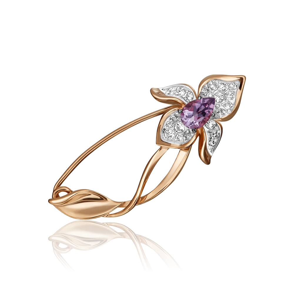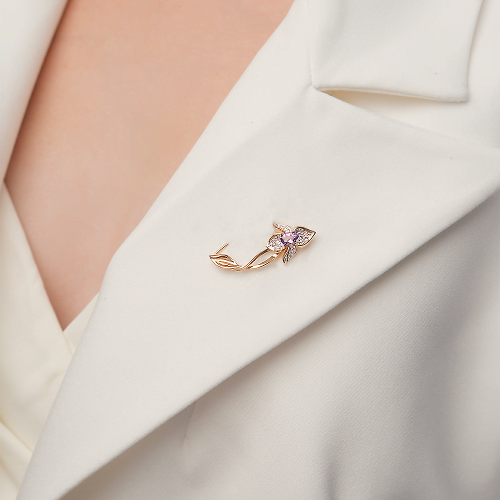 Брошь-булавка из красного золота 585 пробы в стиле флористика. с натуральными камнями. Силуэт украшения выполнен в виде лотоса (символа любви, женственности и искренности). Изделие декорировано миниатюрными топазами=white и сиреневым аметистом огранки груша в центре композиции. Закрепка камней выполнена вручную. Светлое родиевое покрытие на лепестках усиливает сияние камней. Украшение подойдёт для светских мероприятий и деловых встреч, неформальных вечеринок, а также к повседневному гардеробу.