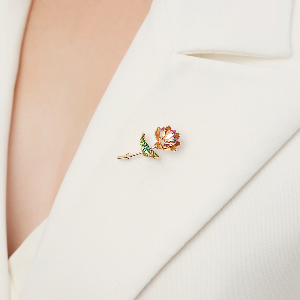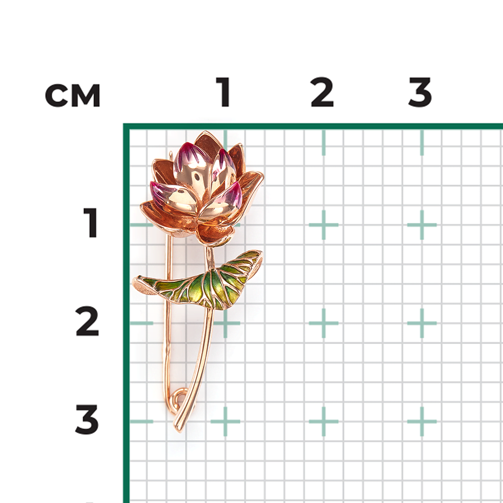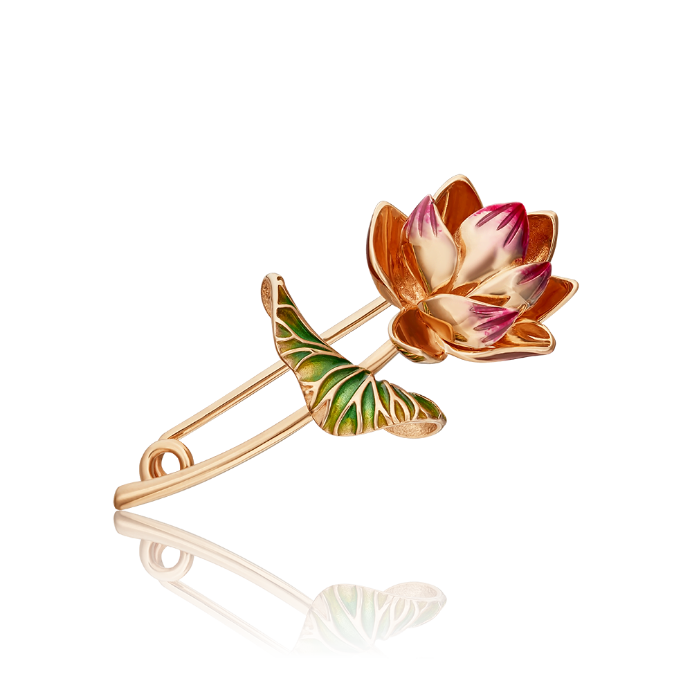 Брошь-булавка из красного золота 585 пробы с объёмным силуэтом лотоса. Лотос – символ духовной мудрости, чистоты и счастья. Дизайн украшения выполнен в стиле флористика. Изделие вручную расписано разноцветной витражной эмалью, что придаёт силуэту цветка живость и яркость. Удобный и надёжный замок броши, делает украшение комфортным для длительного ношения. Изделие подойдёт для торжественных или светских мероприятий, коктейльных вечеринок и для повседневного ношения.