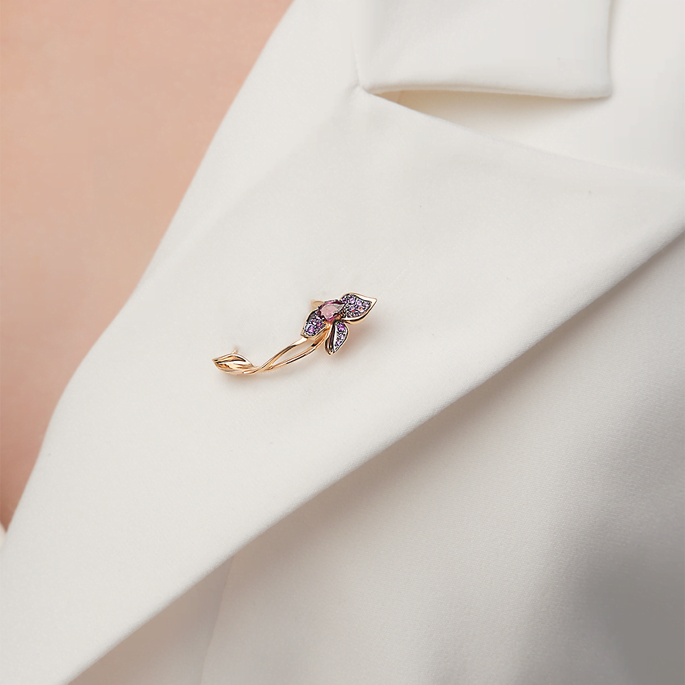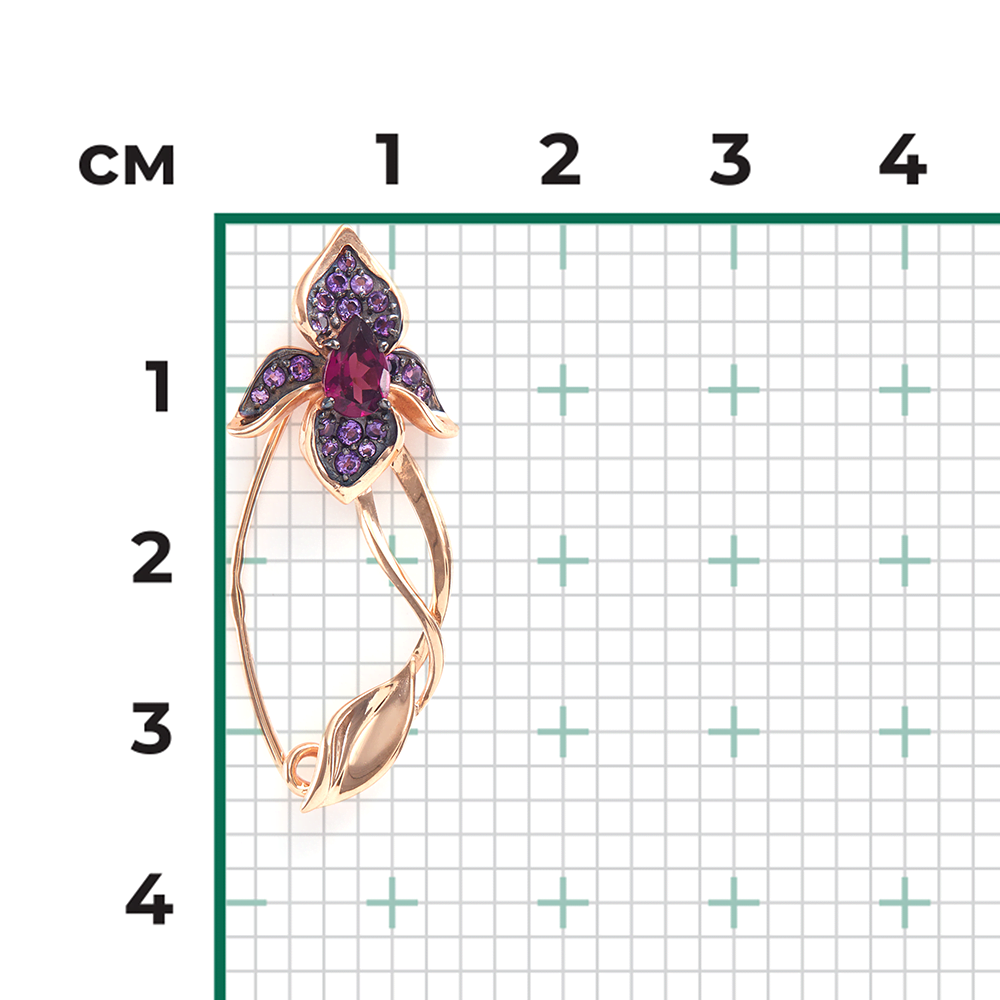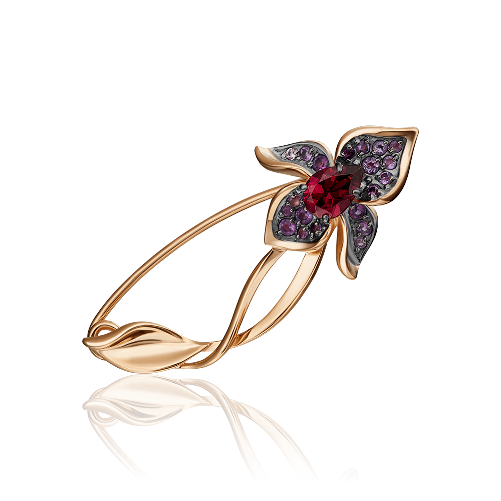 Брошь-булавка из красного золота 585 пробы в стиле флористика, с натуральными гарнатами и аметистами. Силуэт украшения выполнен в виде лотоса (символа любви, женственности и искренности). Изделие инкрустировано миниатюрными сиреневыми аметистами и гранатом огранки груша в центре композиции. Закрепка камней выполнена вручную. Чёрное родиевое покрытие лепестков придаёт дополнительную глубину украшению. Брошь подойдёт для светских мероприятий и деловых встреч, неформальных вечеринок, а также к повседневному гардеробу.