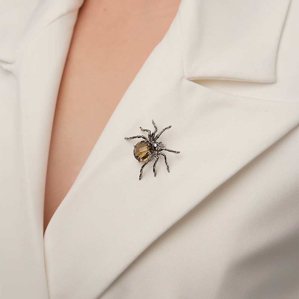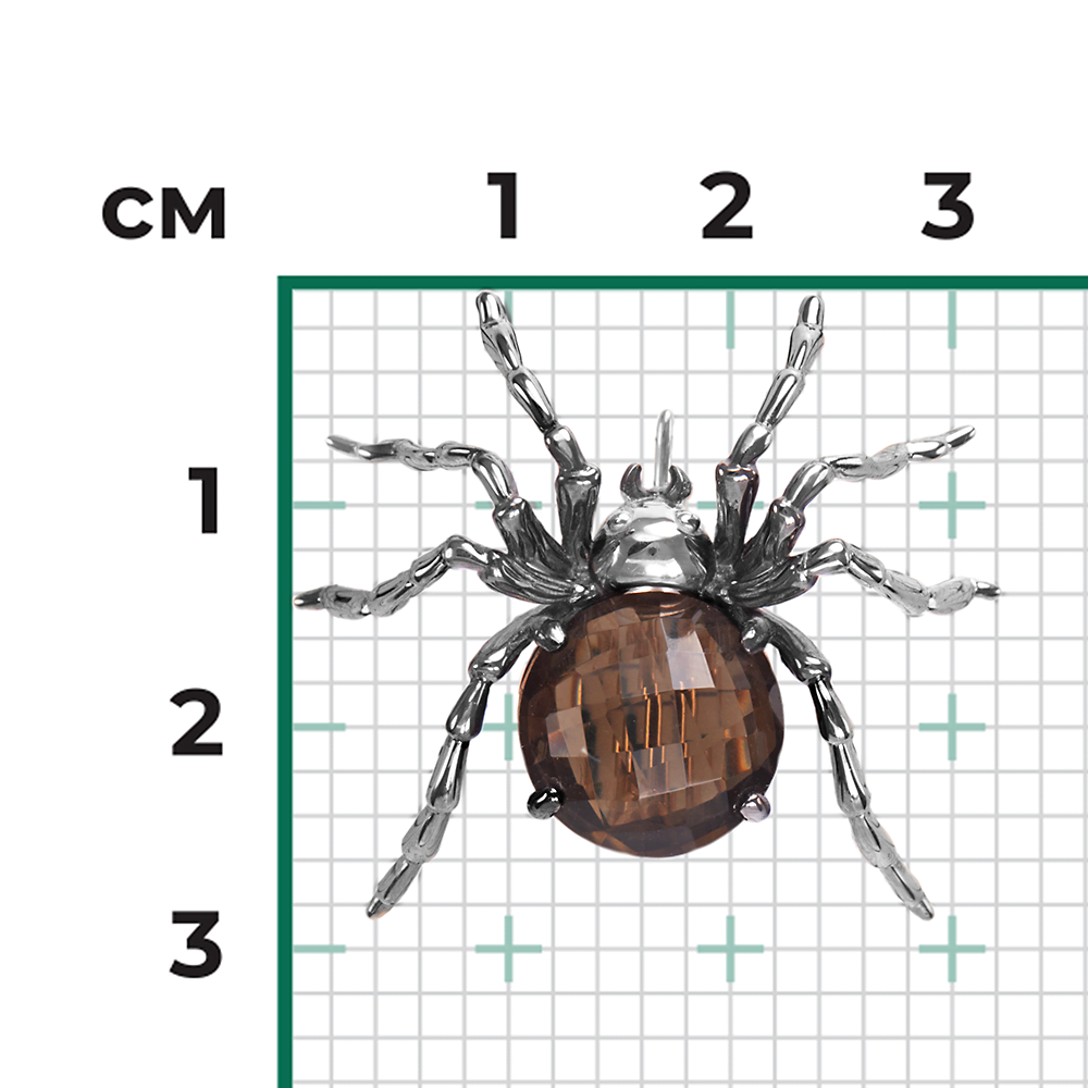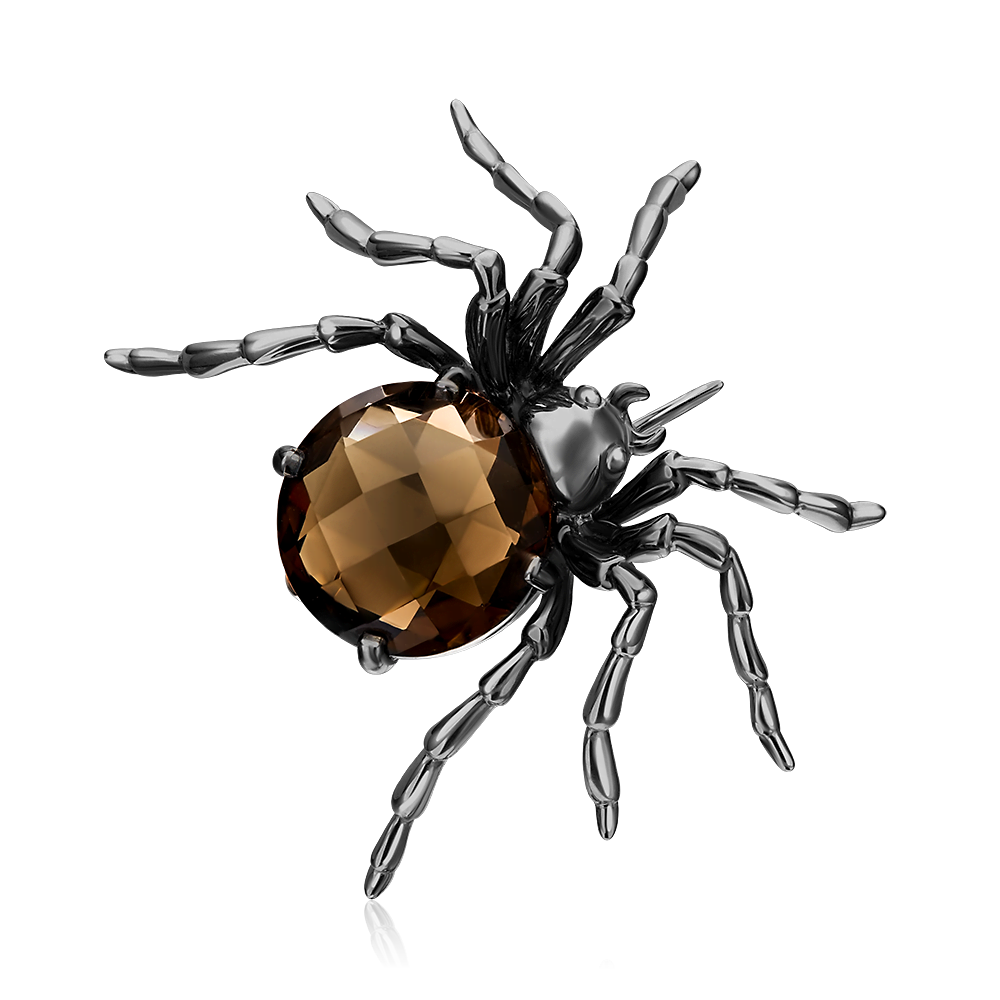 Брошь-паук из белого золота 585 пробы, среднего размера. Дизайн украшения в стиле анималистика. В центре композиции крупный натуральный камень – дымчатый кварц огранки круг. Дополняет дизайн покрытие тёмным родием. Закрепка камня (крапоновая) и родиирование выполнены вручную. Брошь подойдёт к деловому или повседневному стилю, а также для коктейльных или торжественных мероприятий.