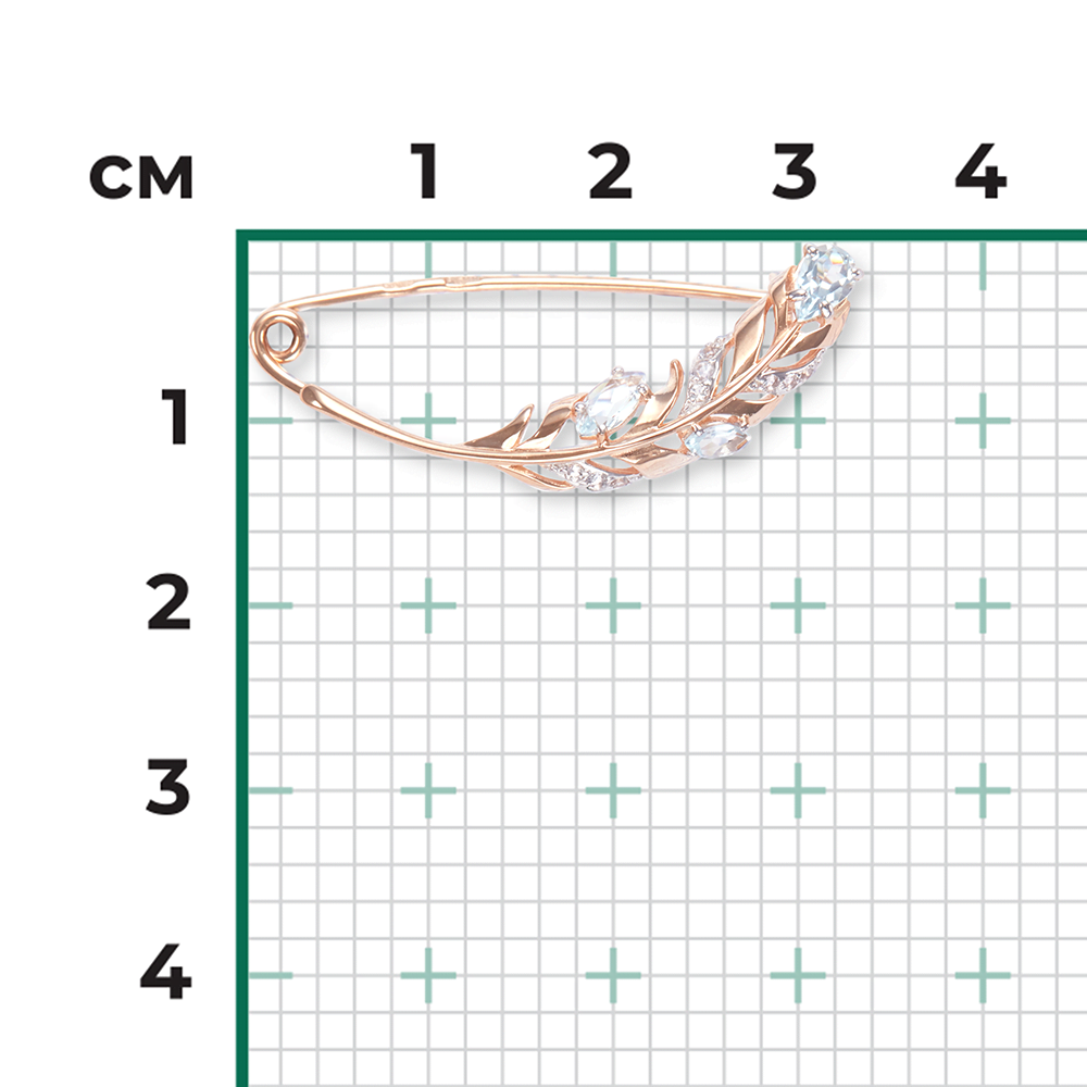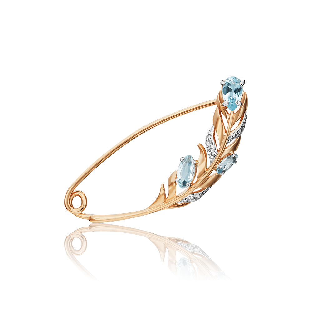 Брошь-булавка среднего размера из красного золота 585 пробы в виде пера. Изделие декорировано голубыми топазами (огранки груша и маркиз) и миниатюрными бесцветными. Дополняет дизайн родированое покрытие. Закрепка камней и родирование выполнены вручную. Яркий глянцевый блеск золота усиливает сияние камней. Брошь подойдёт для повседневного ношения, для светских, торжественных или коктейльных мероприятий.