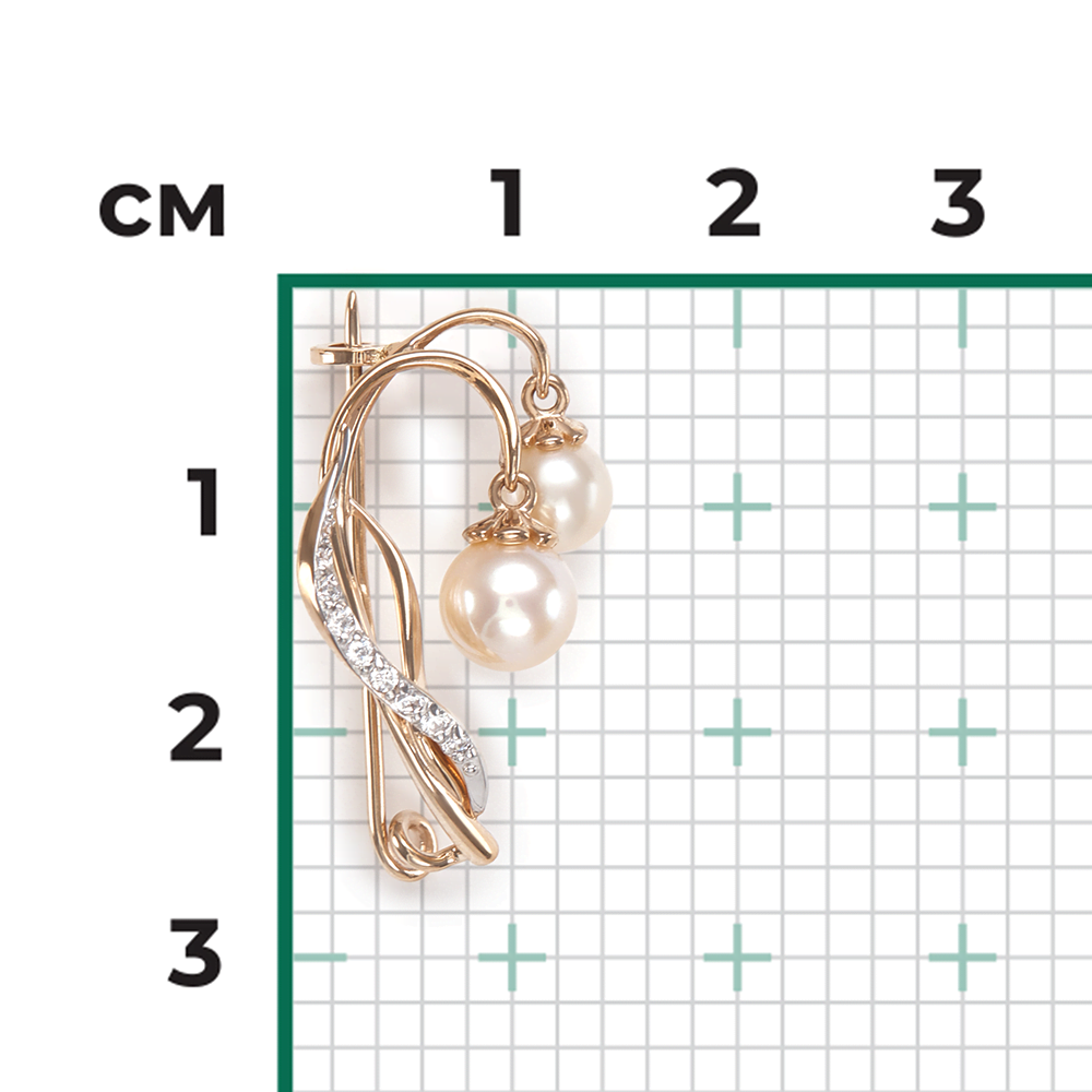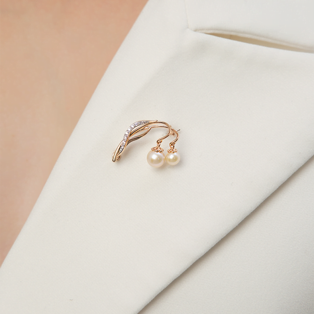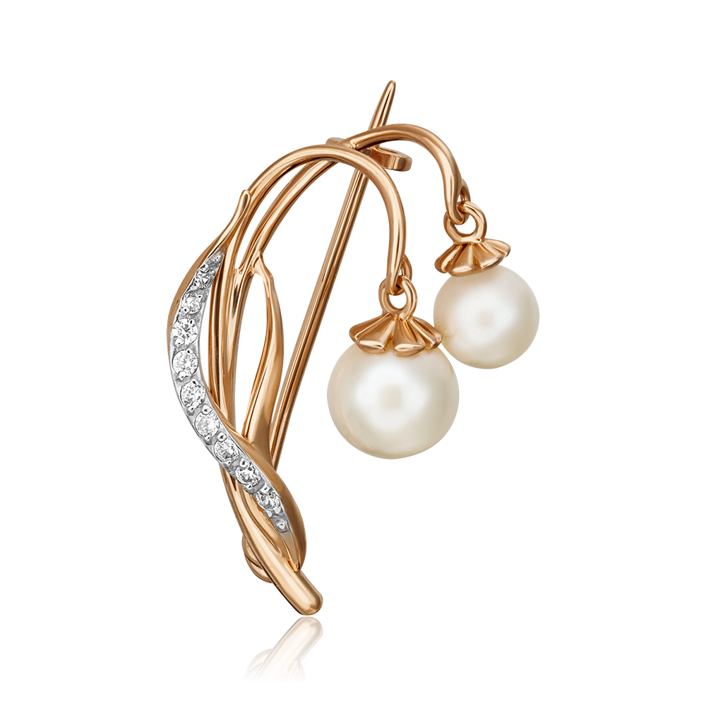 Брошь-булавка из красного золота 585 пробы небольшого размера. Украшение выполнено в стиле флористика – с силуэтом подснежника (символ чистоты, молодости, свежести). Главный декоративный элемент изделия – жемчуг на клеевой закрепке, выполненной вручную. Дополняет дизайн дорожка из миниатюрных фианитов. Брошь подойдёт для коктейльного, светского мероприятий, для повседневного ношения, а также к деловому гардеробу.