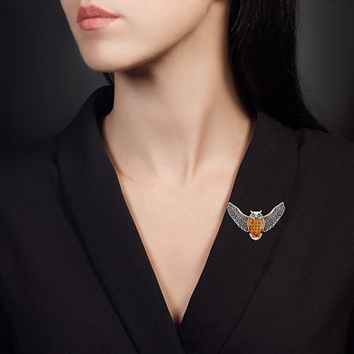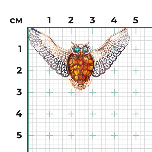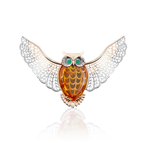 Брошь-подвеска «Сова» из красного золота с янтарём и фианитами