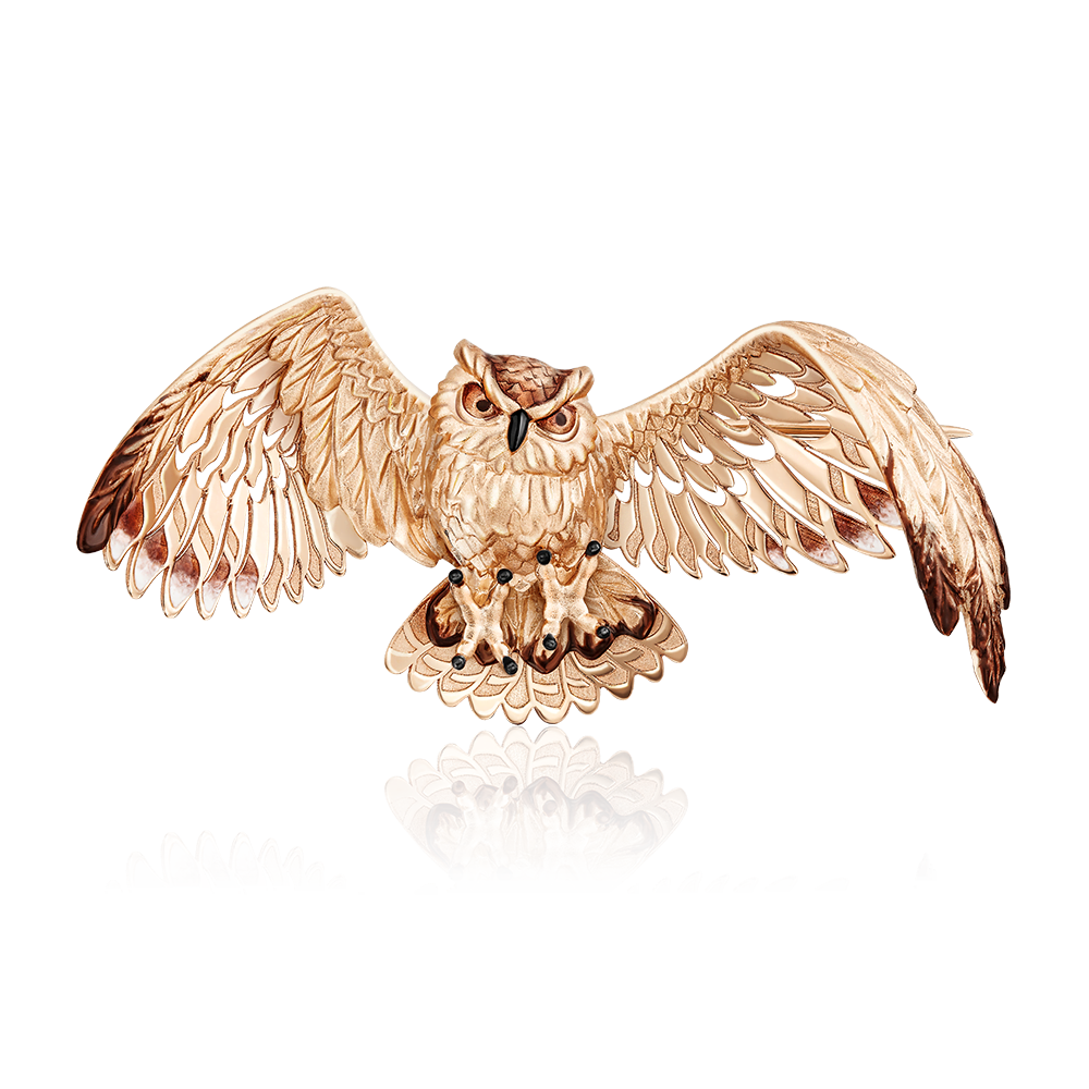 Сложная брошь-сова из красного золота 585 пробы. Дизайн украшения выполнен в стиле анималистика, гиперреализм. Дополняет дизайн роспись эмалью, выполненная вручную. Удобный и надёжный замок-булавка обеспечивает комфорт при длительном ношении. Брошь подойдёт для делового гардероба, а также для торжеств, светских и культурных мероприятий, и также для повседневного ношения.