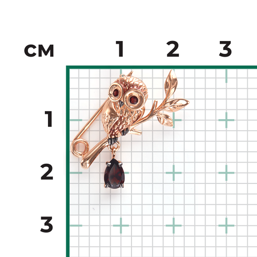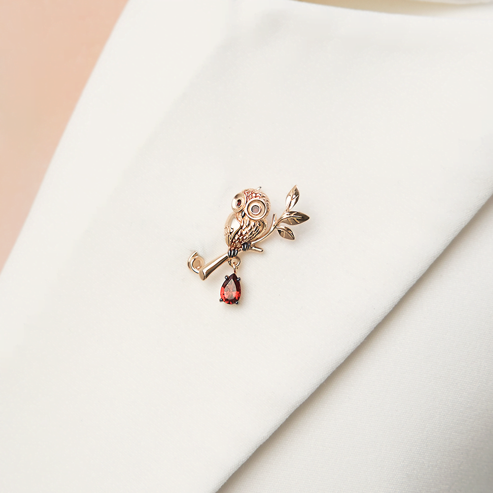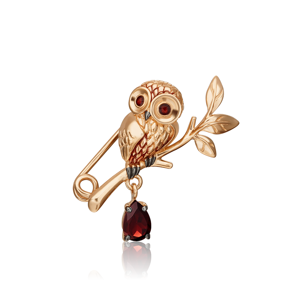 Брошь-сова из красного золота 585 пробы с гранатом, на замке-булавке. Дизайн украшения в стиле анималистика, с элементами флоры.Брошь декорирована натуральным гранатом огранки груша, ювелирной эмалью и тёмным родием. Закрепка камня, эмалирование и родирование выполнены вручную. Подвесной элемент привносит в характер украшения динамичность. Брошь подойдёт к повседневному и деловому гардеробу, а также в качестве коктейльного украшения.