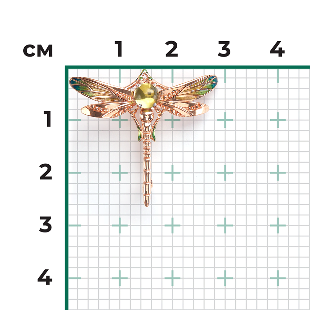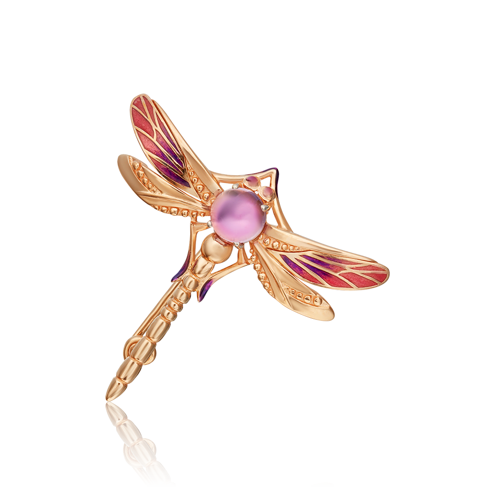 Фантазийная брошь-булавка из красного золота 585 пробы с аметистом. Украшение объёмное, выполнено в стиле анималистика – силуэт изделия повторяет силуэт стрекозы (символ храбрости, счастья и удачи). Брошь украшена крупным аметистом огранки кабошон, золотыми гранулами и раскрашена витражной эмалью. Эмалирование и закрепка камня выполнены вручную. Украшение подойдёт в качестве коктейльного, для неформальных встреч, а также к повседневному гардеробу.
