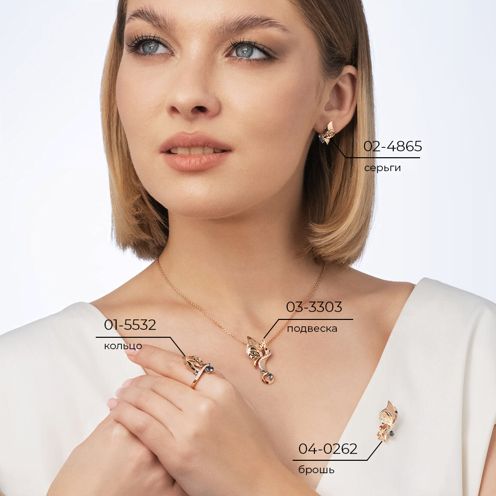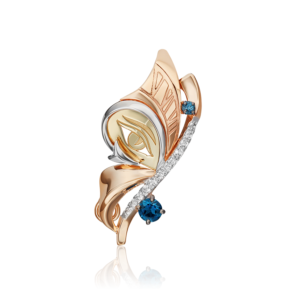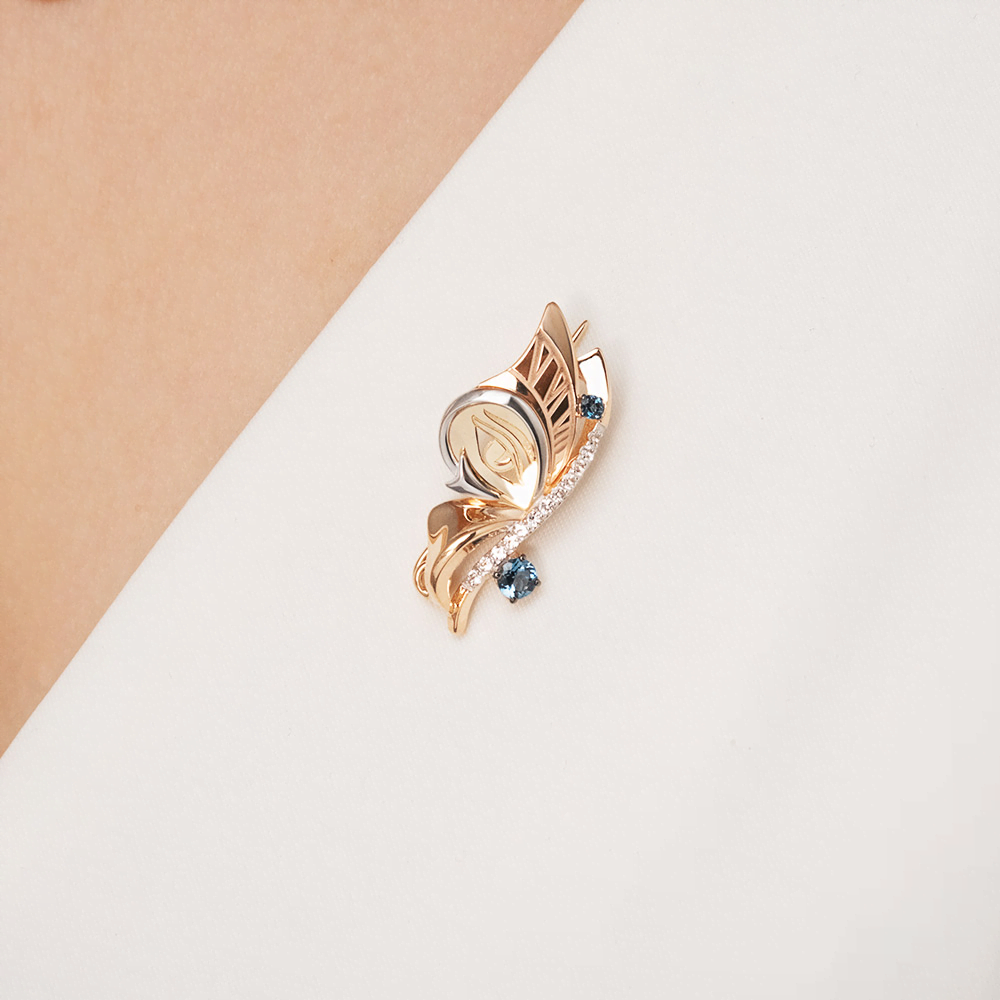 Брошь из красного и лимонного (желтого) золота 585 пробы с топазами из коллекции PLATINA ART от ювелирного бренда PLATINA. Дизайн украшения в стиле сюрреализм. Декоративная часть выполнена в форме сложной и фантазийной композиции из силуэтов крыла бабочки, стрелы и орнамента в виде глаза. Рисунок нанесён с помощью лазерной гравировки. Брошь инкрустирована натуральными топазами – white и London. Дополняет дизайн покрытие белым родием. Закрепка камней и родирование выполнены вручную. Украшение подойдёт для коктейльных и вечерних мероприятий, а также к повседневному и деловому гардеробу.