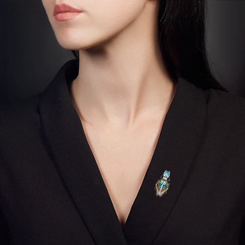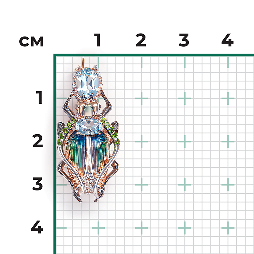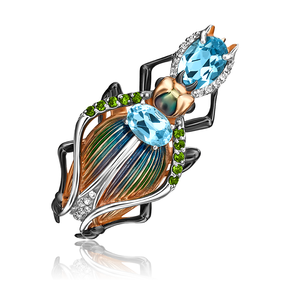 Сложная брошь из красного золота 585 пробы с топазами. Дизайн украшения выполнен в стиле анималистика (силуэт реликтового жука – символ везения, благосостояния и успеха). Изделие декорировано натуральными камнями – крупными топазами огранки овал и миниатюрными хромдиопсидами. Дополняет дизайн роспись витражной эмалью и покрытие родием. Эмалирование, родирование и закрепка камней выполнены вручную. Брошь подойдёт для делового и повседневного гардероба, а также для вечерних или торжественных мероприятий.