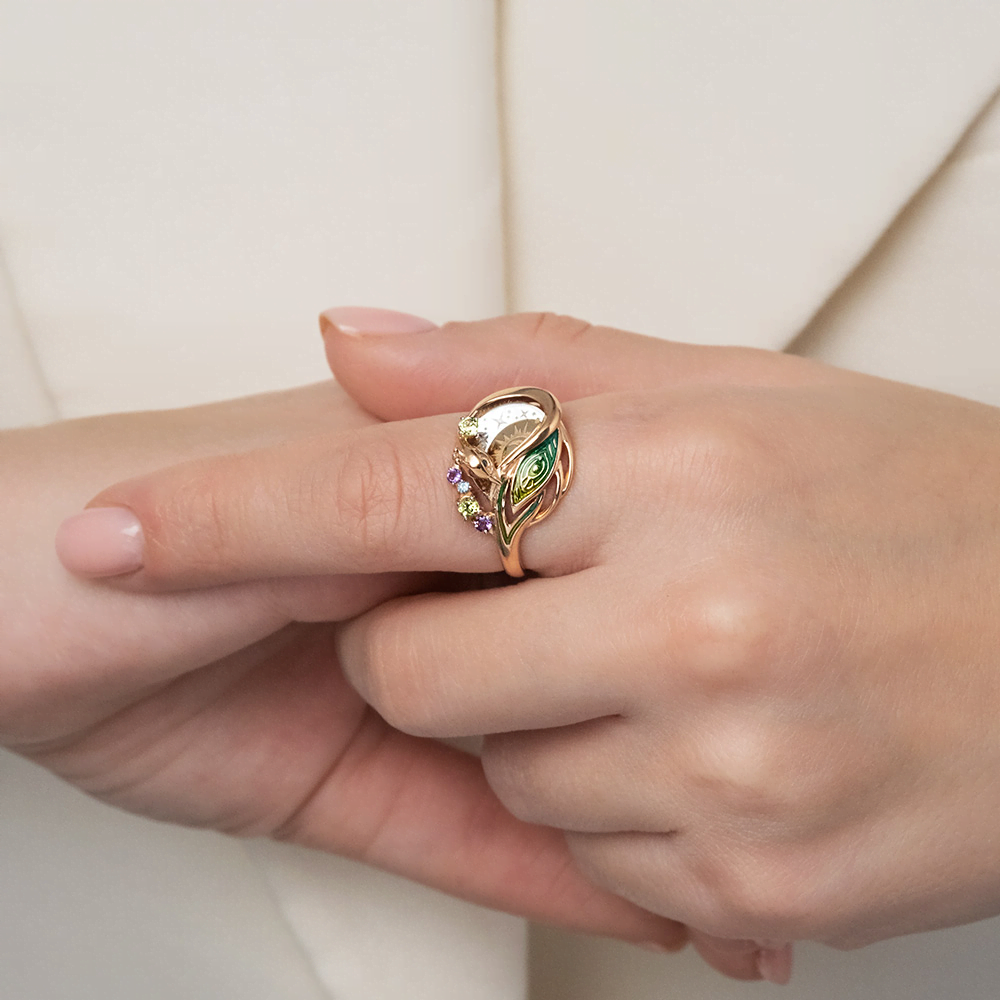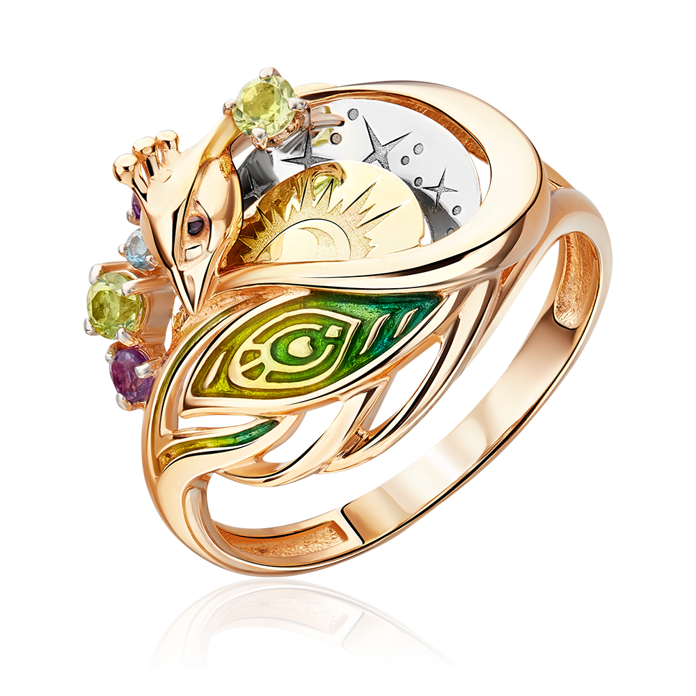 Сложное кольцо из красного, белого и лимонного (желтого) золота 585 пробы с топазом, аметистами и хризолитами из коллекции PLATINA ART от ювелирного бренда PLATINA. Дизайн украшения в стиле сюрреализм. Декоративная часть выполнена с фантазийным силуэтом павлина. Дополняет дизайн орнамент в виде звёзд и солнца, выполненный с помощью лазерной гравировки. Кольцо расписано ювелирной эмалью и инкрустировано натуральными камнями – топазом, аметистами и хризолитами. Закрепка камней и эмалирование выполнены вручную. Украшение подойдёт для коктейльных, вечерних и праздничных мероприятий, а также к деловому и повседневному гардеробу.