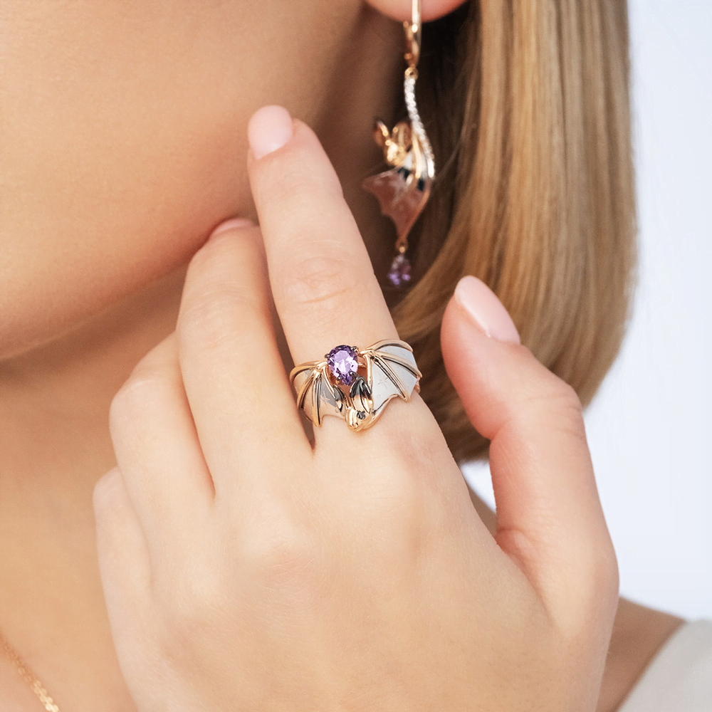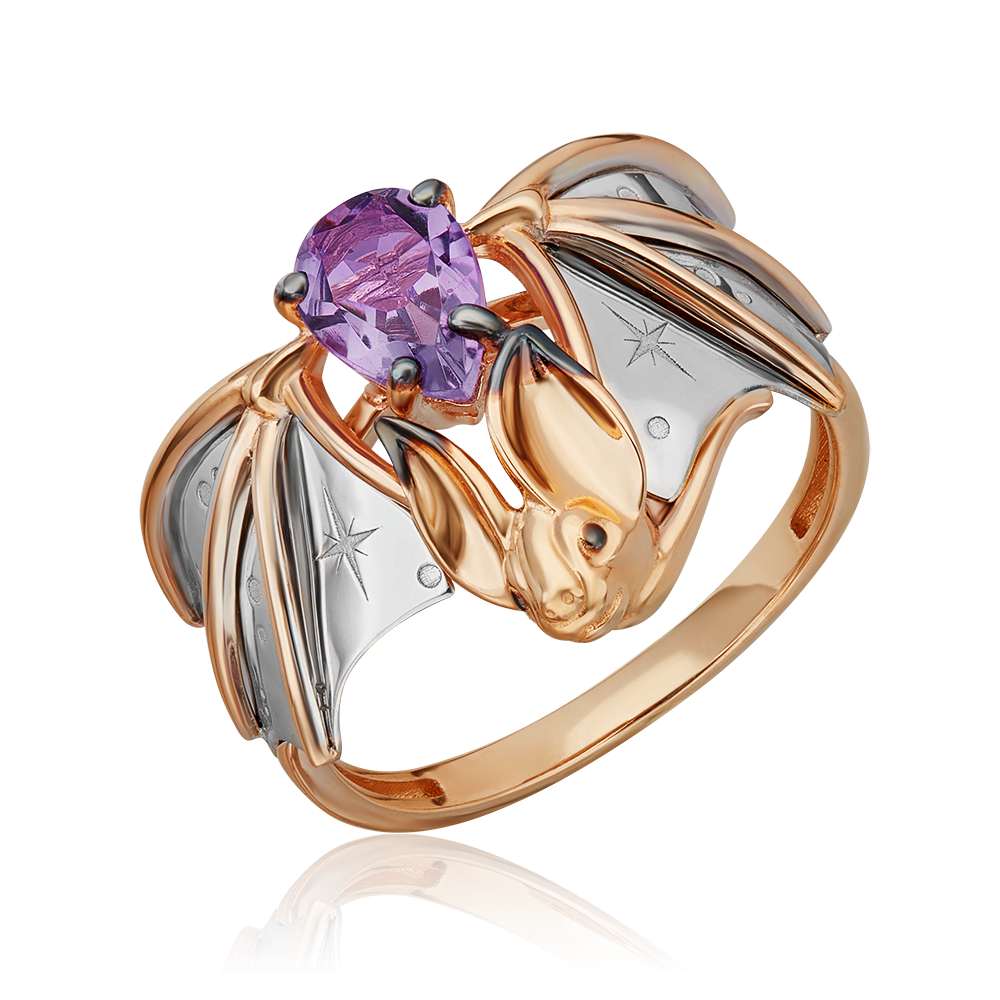 Фантазийное кольцо из красного и белого золота 585 пробы с аметистом из коллекции PLATINA ART от ювелирного бренда PLATINA. Дизайн украшения в стиле сюрреализм, анималистика. Декоративная часть кольца выполнена с силуэтом летучей мыши. Дополняют дизайн узоры в виде звёзд, выполненные с помощью лазерной гравировки и чёрное родиевое покрытие. Украшение инкрустировано натуральным аметистом огранки груша. Родирование и закрепка камня выполнены вручную. Кольцо подойдёт для коктейльных и вечерних мероприятий, а также к неформальному, деловому и повседневному гардеробу.