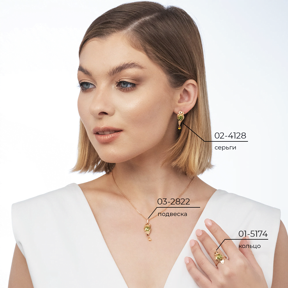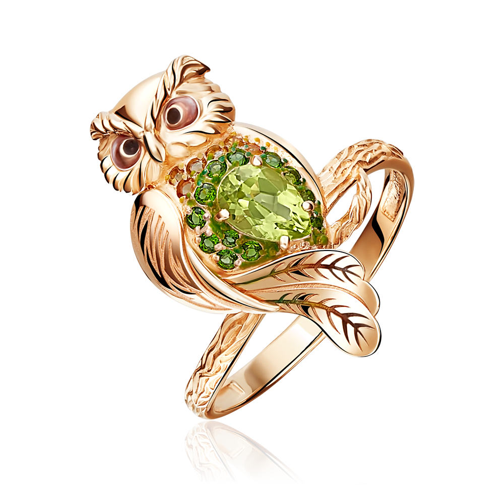Фантазийное кольцо-сова из красного золота 585 пробы с хризолитом, цитринами и хромдиопсидами. Дизайн украшения объёмный, в стиле анималистика. Силуэт совы символизирует мудрость и открытие тайных знаний. Изделие декорировано натуральными камнями - крупным хризолитом огранки груша и минатюрными хромдиопсидами и цитринами. Дополняет дизайн роспись ювелирной эмалью. Закрепка камней и эмалирование выполнены вручную. Кольцо подойдёт для вечерних, праздничных и коктейльных мероприятий, бизнес-встреч, а также к повседневному гардеробу.
