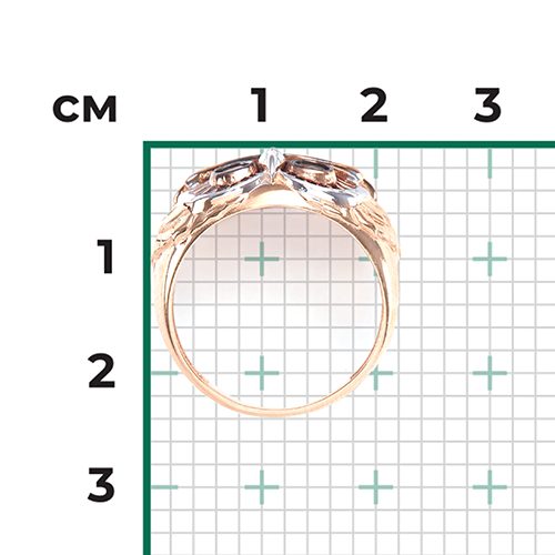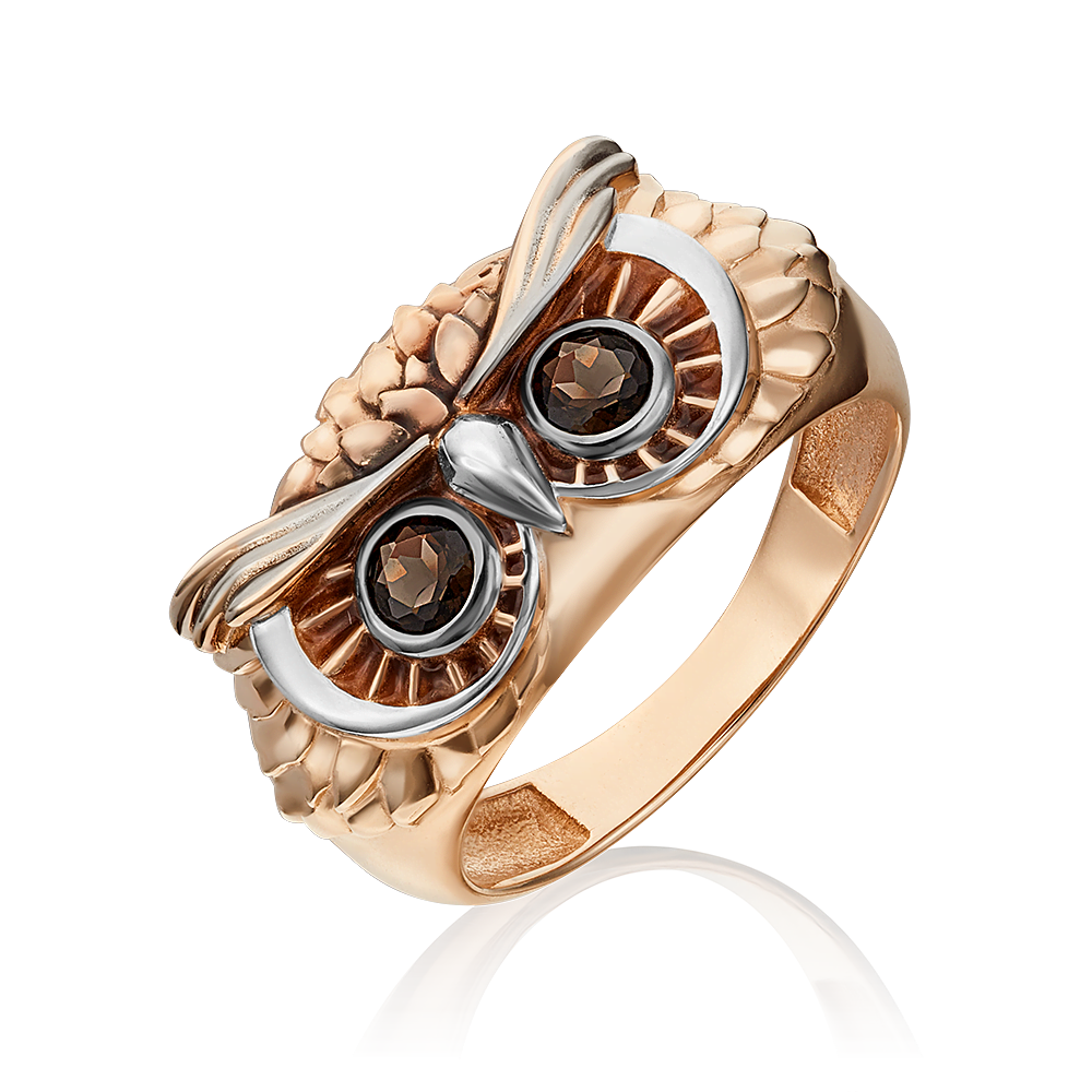 Сложное сюжетное кольцо-сова из красного золота 585 пробы с дымчатым кварцем. Дизайн изделия – анималистика. Декоративная накладка выполнена в виде совиной головы. Украшено фактурным орнаментом, имитирующими птичьи перья, белым родием (клюв и глаза птицы) и ювелирной эмалью. Композицию дополняют дымчатые кварцы круглой огранки. Глухая закрепка камней гарантирует их сохранность. Украшение подойдёт в качестве яркого коктейльного, в неформальный или бизнес-гардероб, для повседневного ношения.