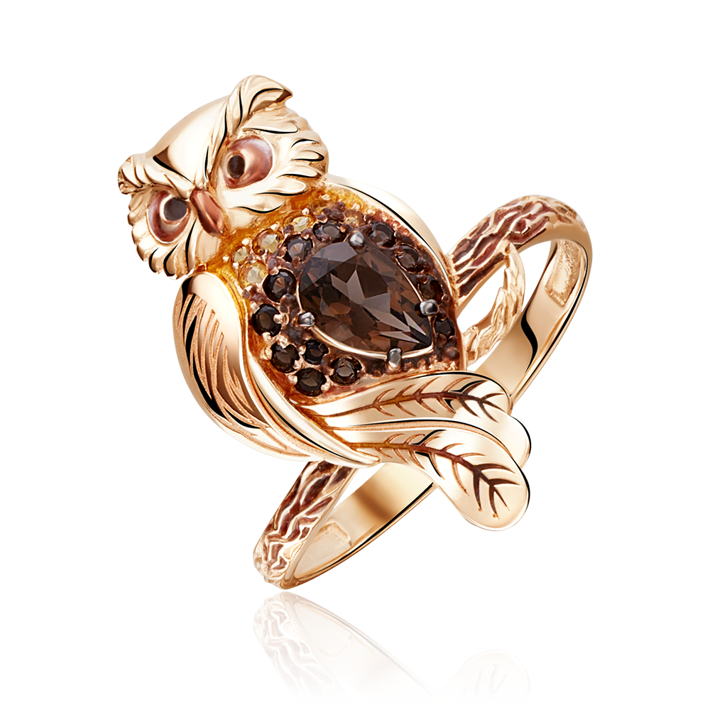 Фантазийное кольцо-сова из красного золота 585 пробы с дымчатыми кварцами и цитринами. Дизайн украшения объёмный, в стиле анималистика. Силуэт совы символизирует мудрость и открытие тайных знаний. Изделие декорировано натуральными камнями - дымчатыми кварцами огранки груша и круг и миниатюрными цитринами. Дополняет дизайн роспись ювелирной эмалью. Закрепка камней и эмалирование выполнены вручную. Кольцо подойдёт для вечерних, праздничных и коктейльных мероприятий, бизнес-встреч, а также к повседневному гардеробу.