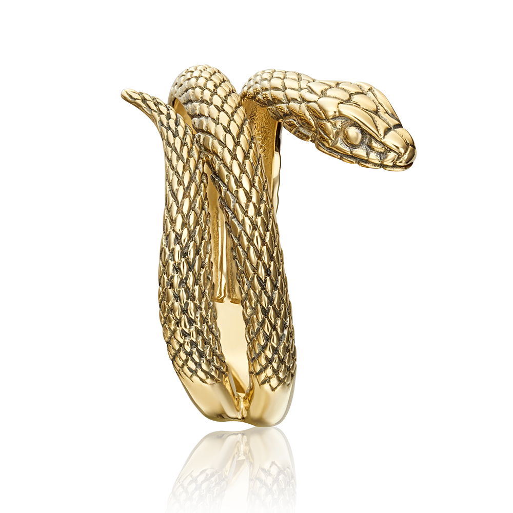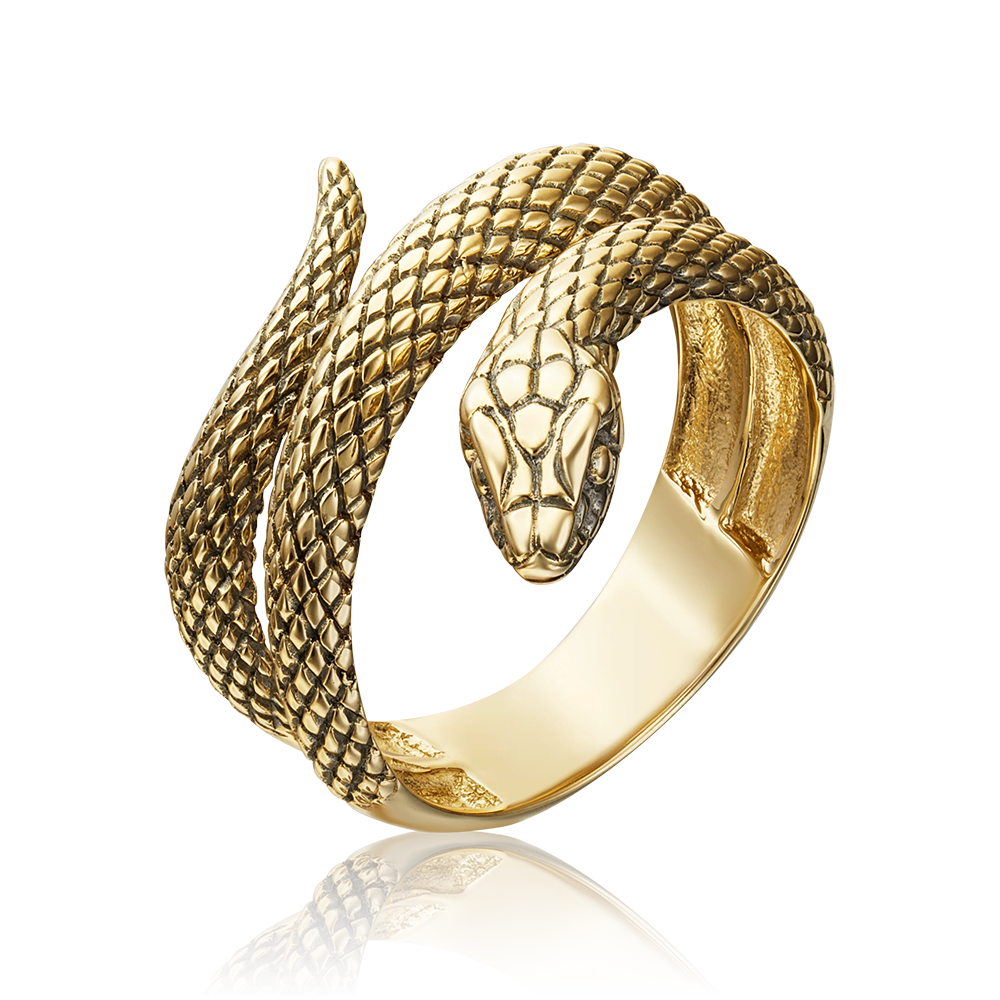 Сюжетное кольцо-змея из лимонного (желтого) золота 585 пробы. Дизайн украшения в стиле анималистика, гиперреализм. Силуэт кольца украшен фактурами, повторяющими рисунок змеиной кожи. Для придания им дополнительного объёма и большей естественности кольцо было покрыто чёрным родием и вручную располировано. Украшение подойдёт в качестве вечернего, в неформальный или бизнес-гардероб, а также для ежедневного ношения.