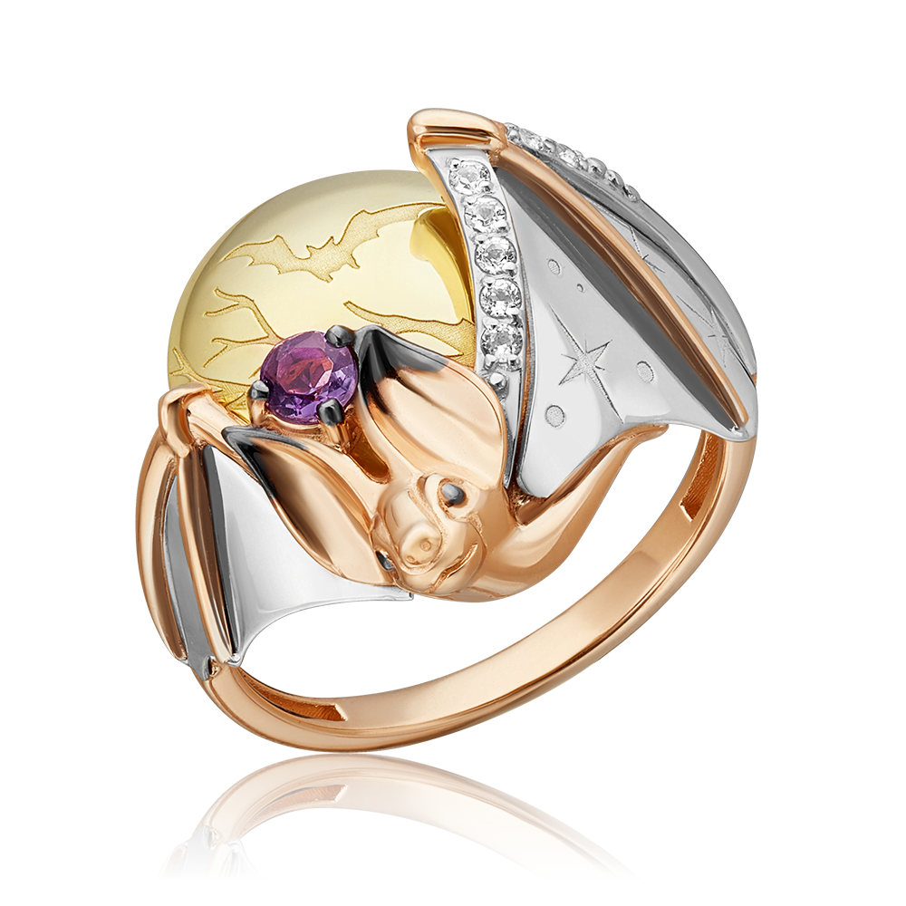 Объёмное кольцо из красного, белого и лимонного (желтого) золота 585 пробы с аметистом и white-топазами из коллекции PLATINA ART от ювелирного бренда PLATINA. Дизайн украшения в стиле сюрреализм. Декоративная часть выполнена в виде фантазийной композиции из силуэтов летучей мыши и полнолуния. Дополняет дизайн лазерная гравировка на крыльях мыши и луне и покрытие чёрным родием. Кольцо инкрустировано натуральными камнями – аметистом и white-топазами. Закрепка камней и родирование выполнены вручную. Украшение подойдёт для коктейльных, вечерних мероприятий, а также к повседневному, деловому и неформальному гардеробу.