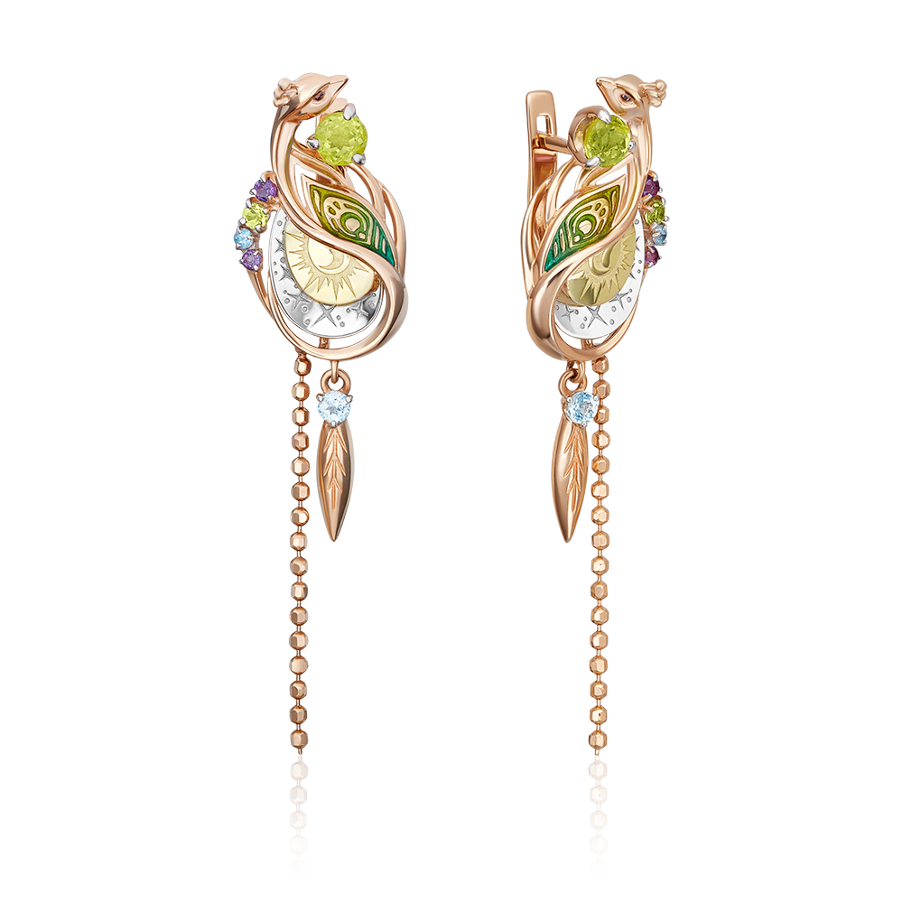 Сложные серьги с английским замком из красного, белого и лимонного (желтого) золота 585 пробы с топазами, аметистами и хризолитами из коллекции PLATINA ART от ювелирного бренда PLATINA. Дизайн украшения в стиле сюрреализм. Декоративная часть выполнена с фантазийным силуэтом павлина. Дополняет дизайн лазерная гравировка и роспись ювелирной эмалью. Серьги инкрустированы натуральными камнями – топазами, аметистами, хризолитами. Закрепка камней и эмалирование выполнены вручную. Украшение подойдёт для коктейльных и вечерних мероприятий, а также к деловому и повседневному гардеробу.