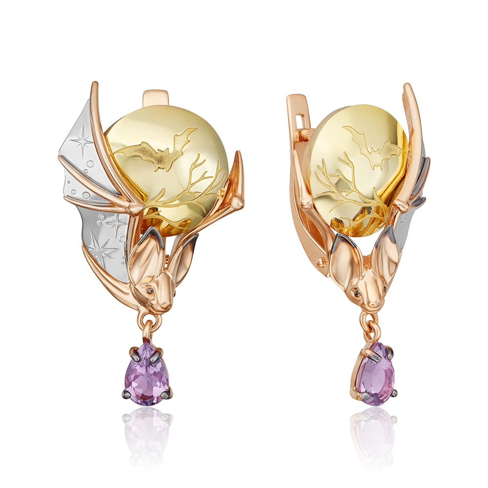 Фантазийные серьги с английским замком из красного, белого и лимонного (желтого) золота 585 пробы с аметистами из коллекции PLATINA ART от ювелирного бренда PLATINA. Дизайн украшения в стиле сюрреализм. Декоративная часть выполнена в виде сложной композиции из силуэтов летучей мыши и полнолуния. Дополняет дизайн покрытие чёрным родием и орнамент из звёзд, выполненный с помощью лазерной гравировки. Украшение инкрустировано натуральными аметистами огранки груша. Закрепка камней и родирование выполнены вручную. Подвесной элемент привносит динамичность в характер украшения. Серьги подойдут для коктейльных и вечерних мероприятий, а также к повседневному, деловому и неформальному гардеробу.