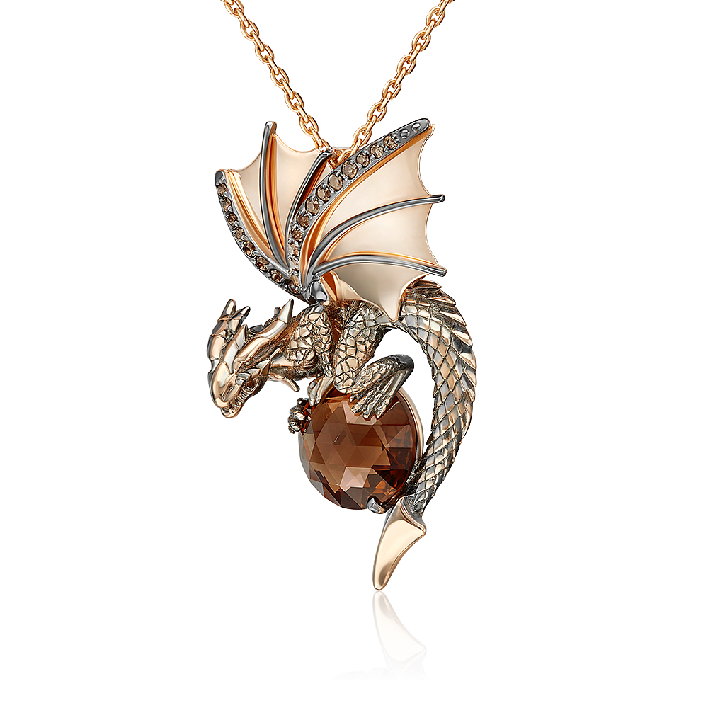 Эффектная подвеска «Дракон» из красного золота 585 пробы с дымчатым кварцем и цитринами из коллекции «Большой замысел» от ювелирного бренда PLATINA. Дизайн украшения объёмный, детализированный, в готическом и анималистическом стилях. Образ дракона символизирует могущество, благородство, защиту, богатство, удачу. Покрытие чёрным родием усиливает реалистичность ювелирного образа. Блеск крупного дымчатого кварца и миниатюрных цитринов добавляют колорит и эффектность украшению. Закрепка камней и родирование выполнены вручную. Подвеска станет выразительным и символичным акцентом образа
