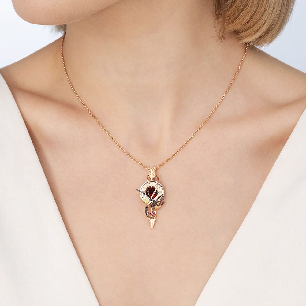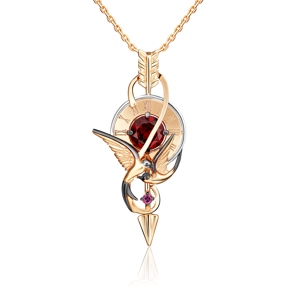 Фантазийная подвеска-ласточка из красного и белого золота 585 пробы с гранатом. Дизайн украшения сложный, с элементами анималистики и модерна. Композицию изделия составляют силуэты ласточки (Удача), часов (Время), стрелы (Стремление) и бесконечности (Вечность). Подвеска инкрустирована гранатами (пироп и родолит), закрепка которых выполнена вручную. Дополняют дизайн рисунок тёмным родием и фактуры. Подвеска подойдёт в качестве вечернего или коктейльного украшения, а также к деловому и даже повседневному стилю.