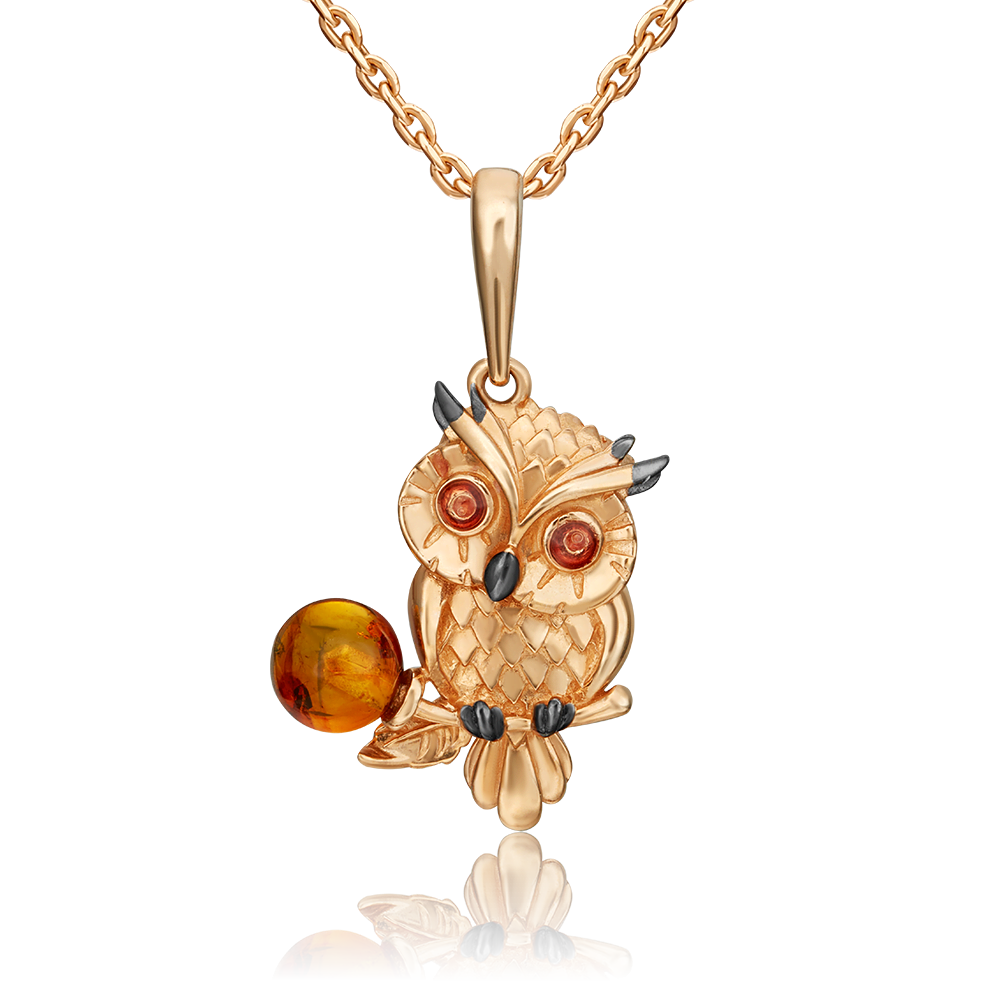 Подвеска «Сова» из красного золота с янтарём и эмалью