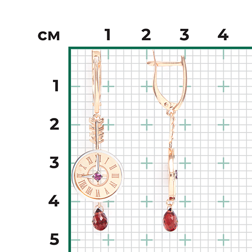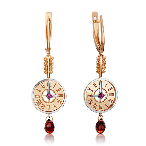 Фантазийные серьги-часы с английским замком из красного и белого золота 585 пробы с гранатом. Дизайн украшений в стиле модерн. Изделия украшены гранатами родолитами и пиропами (в подвеске), вставками из белого золота, оттиском циферблата часов (стрелки выставлены на 15:00 и 21:00), силуэтом наконечника стрелы (символ стремления). Дополнительный подвесной элемент, украшенный камнем огранки бриолет, усиливает динамику в силуэте украшений. Изысканные серьги, они подойдут как в качестве стильных вечерних, коктейльных, так и в неформальный/бизнес-гардероб.